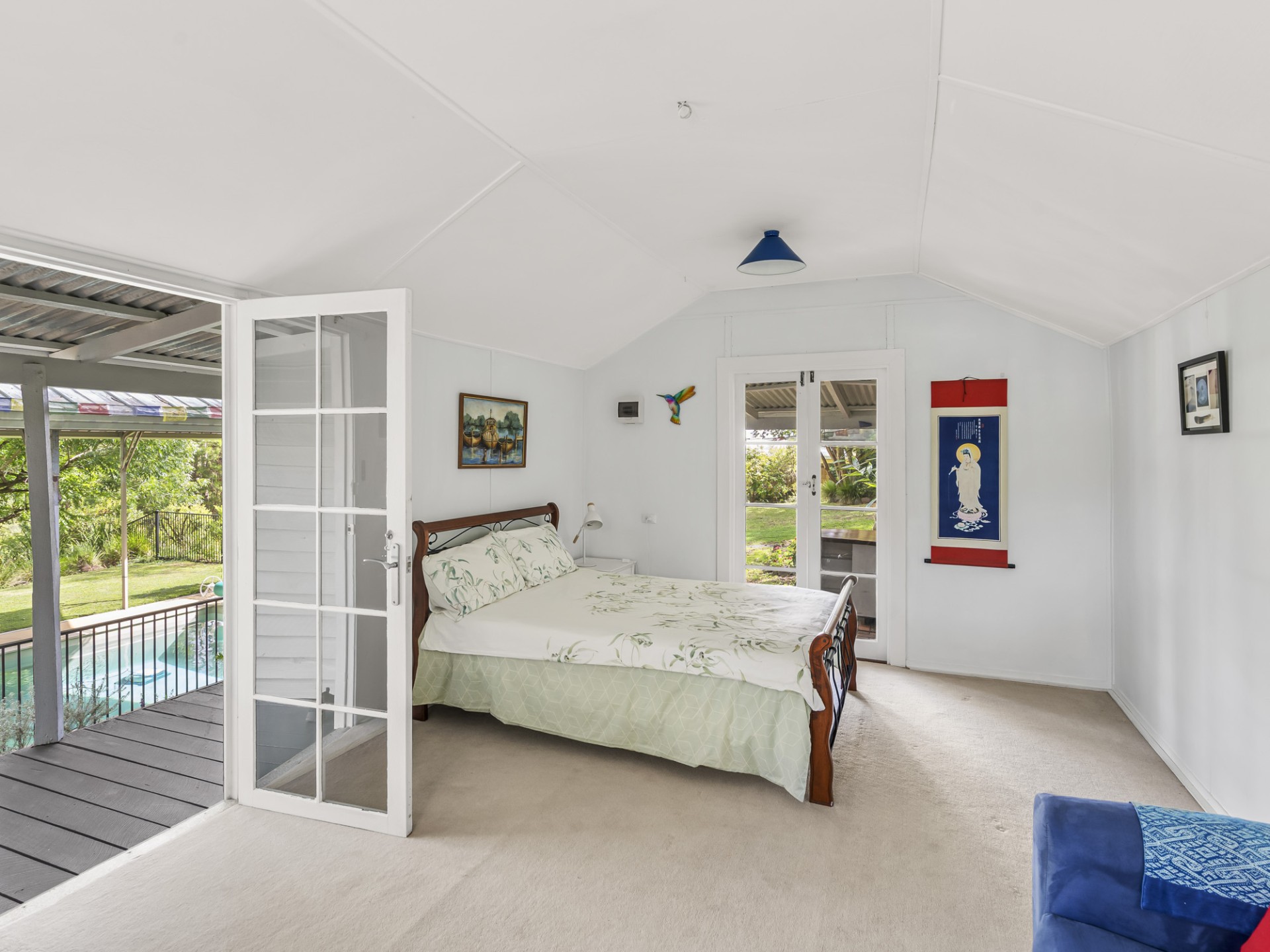 The comfortable studio cabin 20m from the house is ideal for guests, a work from home space, a teenage retreat or could easily be made into self contained accommodation for an additional income opportunity/granny flat. The cabin overlooks the 8x4m council approved swimming pool that is delightfully situated looking out to eucalypt forest with views to the west. The pool has a low maintenance ozone filtration system and a solar hot water system for year round swimming. The pool area is covered by a 4m high, 12m long steel and colourbond gable roof, keeping the area protected from the elements and making it perfect for swimming, lounging and entertaining in any weather. Enjoy night swimming with the coloured underwater lights whilst serenaded by the sounds of nature in this subtropical heaven.