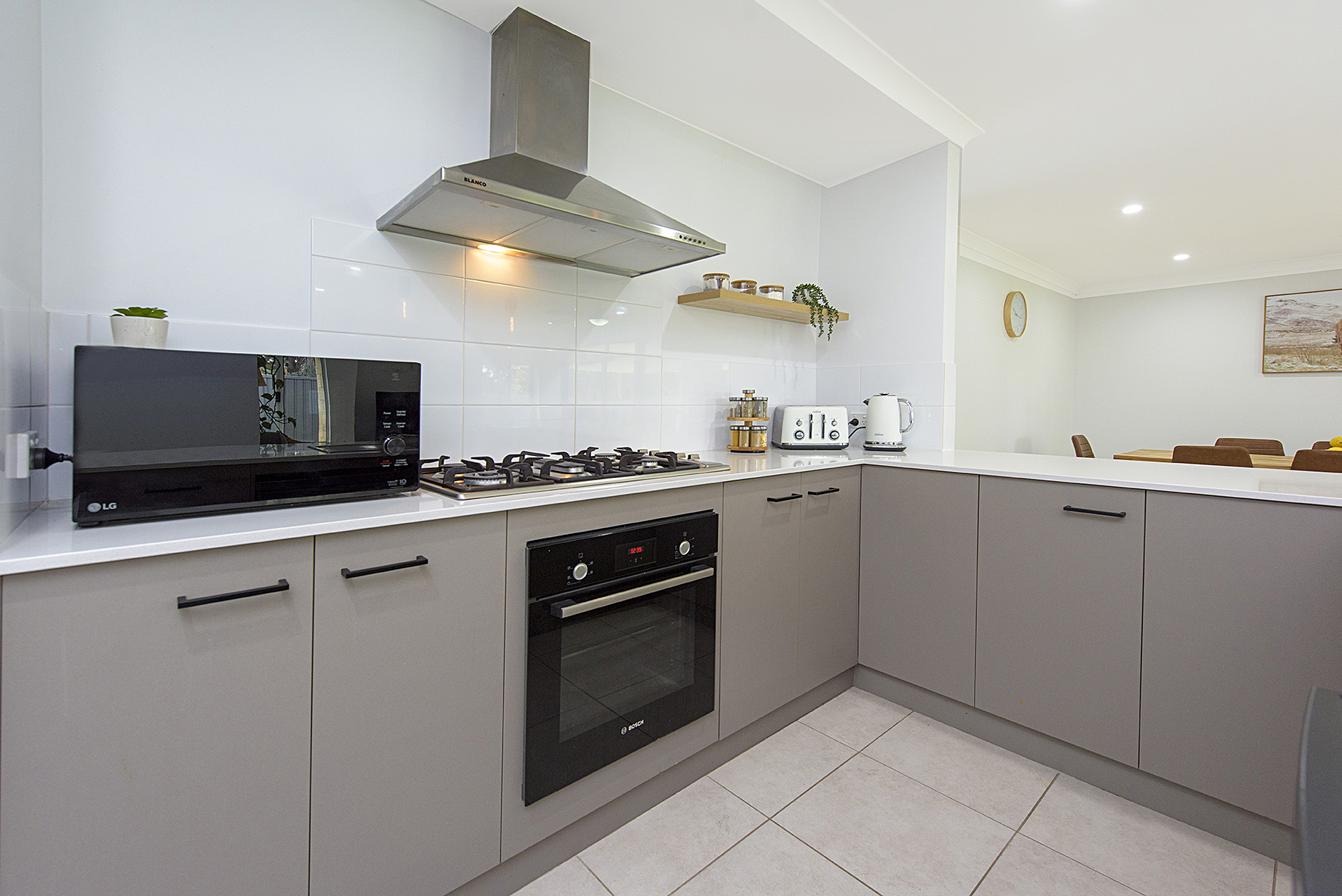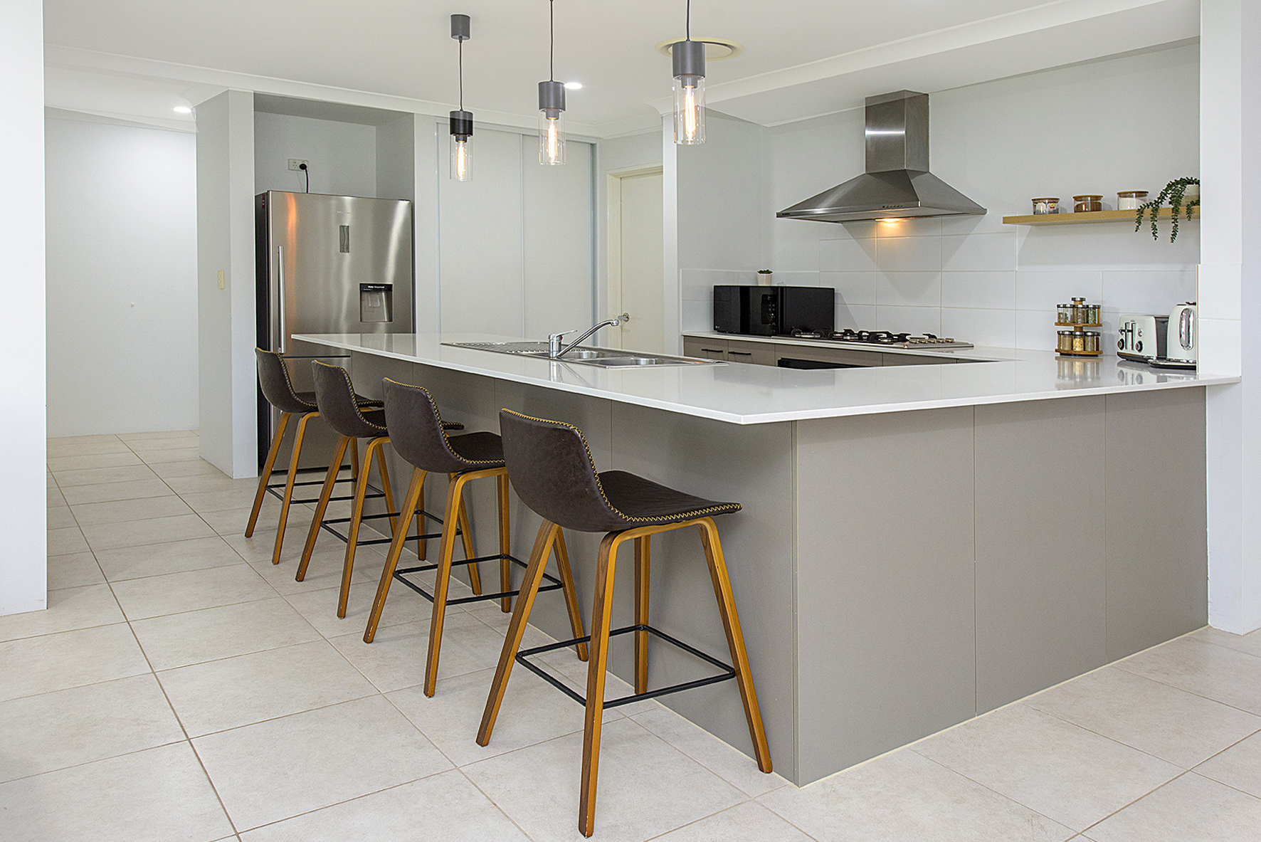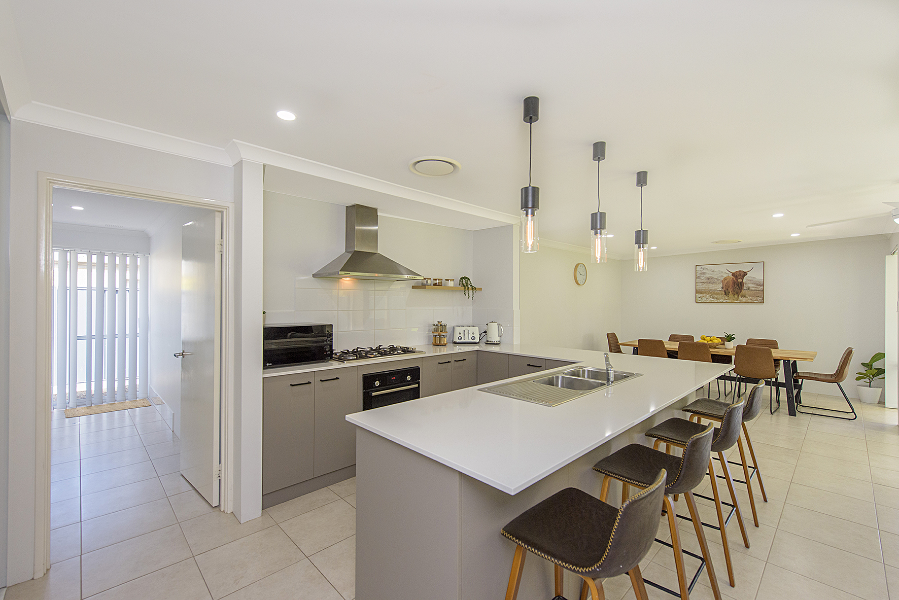• Large open‑plan kitchen with stone benchtops, double pantry, 5‑burner cooktop, near‑new oven & pendant lights
