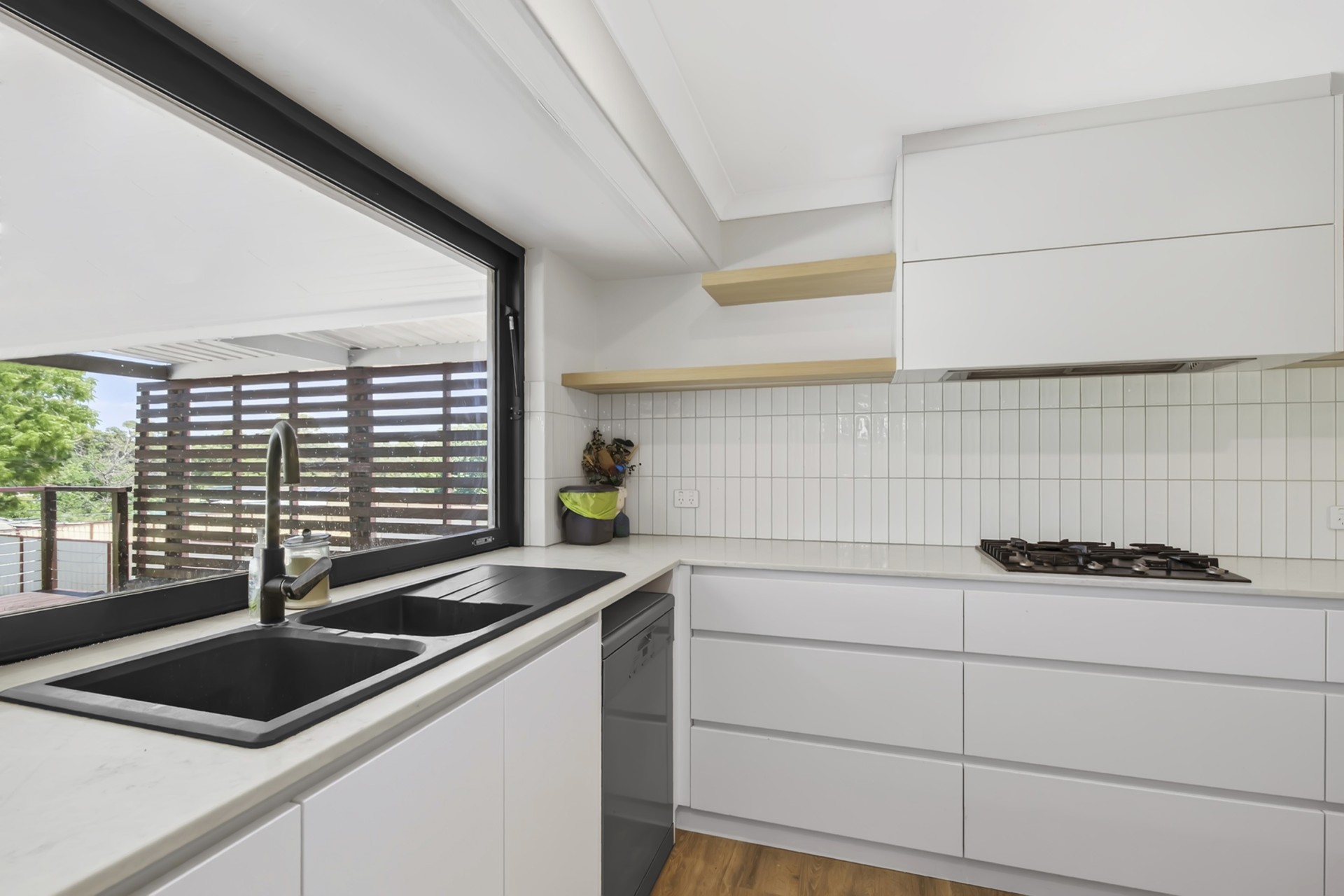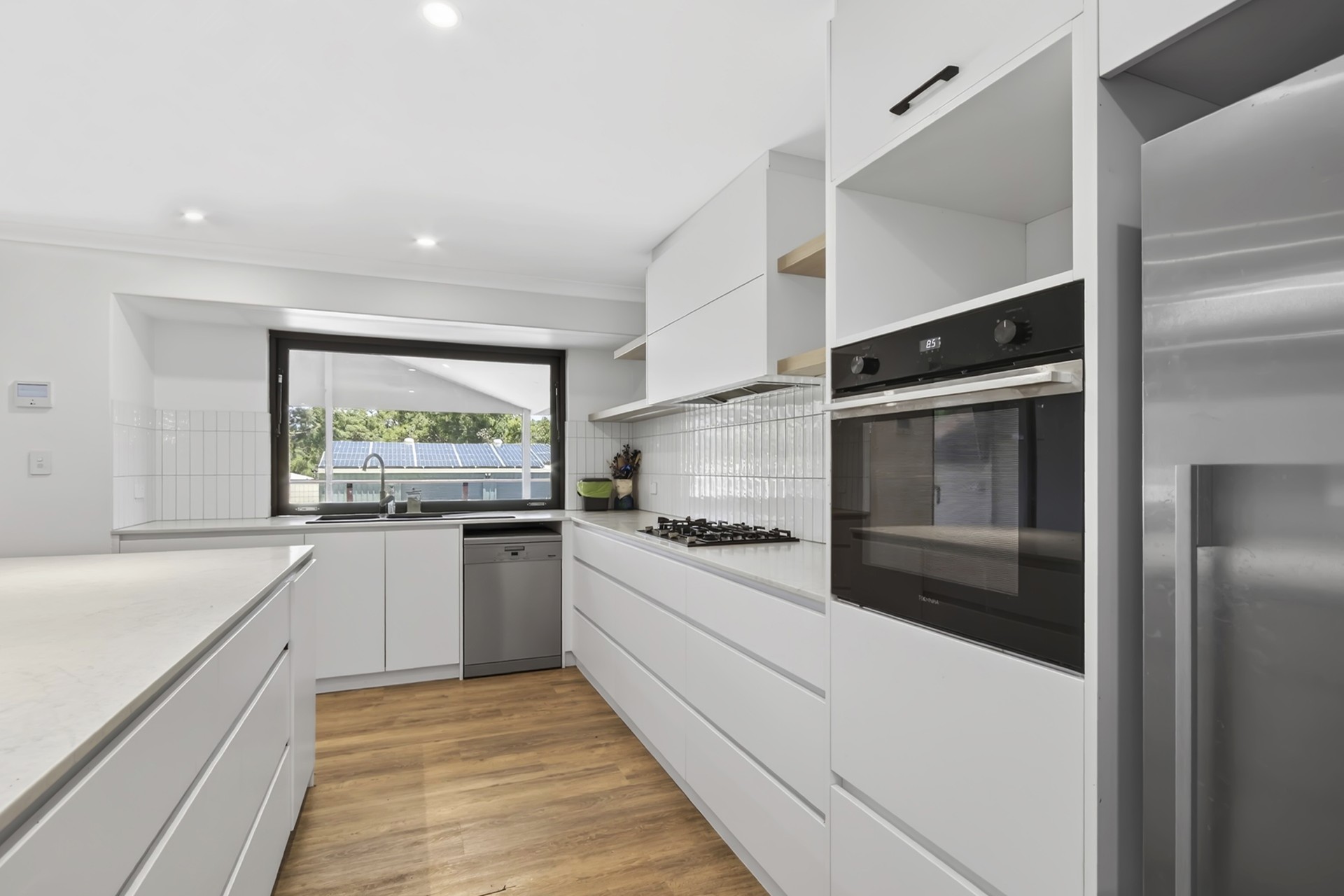 As you step inside, you're greeted by a light-filled open plan living space, complemented by low-maintenance timber-look flooring that seamlessly flows into the stylish modern kitchen. The kitchen is a culinary delight, featuring an electric range-hood, gas hotplate, wall oven, double sinks, recesses for a microwave and large refrigerator, and ample built-in storage options. All the best quality appliances are included , along with a built in dishwasher.