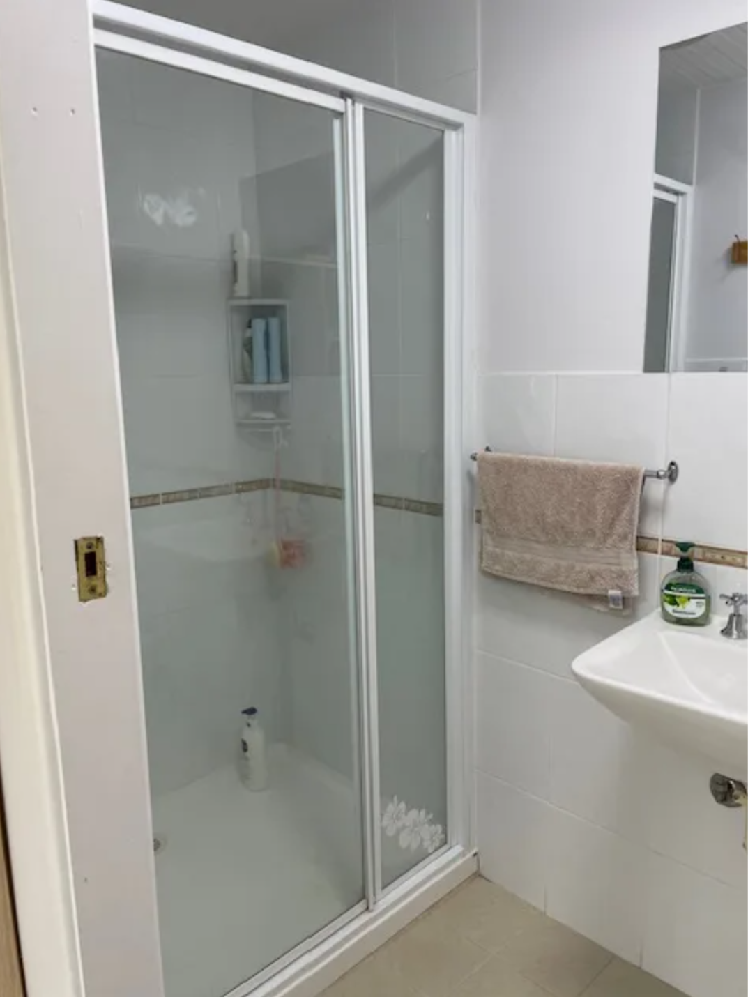 Light and bright, east and north-facing, carpeted master bedroom with double built-in robes and ensuite with glass shower, sink, WC, mirror and open storage shelves
