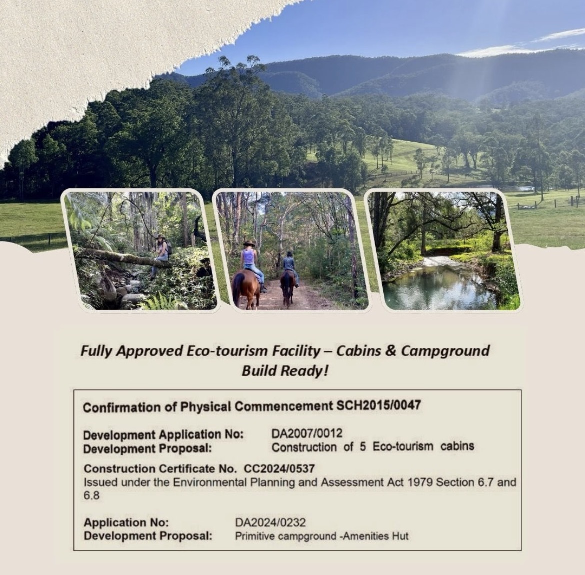 The property includes a fully approved, build-ready eco-tourism facility. Allowance of 5 cabins and campground with capacity for 108 campers and kitchen/amenities building. With one cabin already established and a manicured campground area this offers room for expansion and profitable commercial potential. The current owners were intending to add a communal building for ceremonies, producing an attractive hinterland venue hire. Fully approved access for motorhomes, caravans, truck, and buses. The internal road to the cabins and the campground area has been constructed along with the front entrance requirements. The current office space is located upon the road and is equipped with internet availability and data point connections for EFTPOS machines.