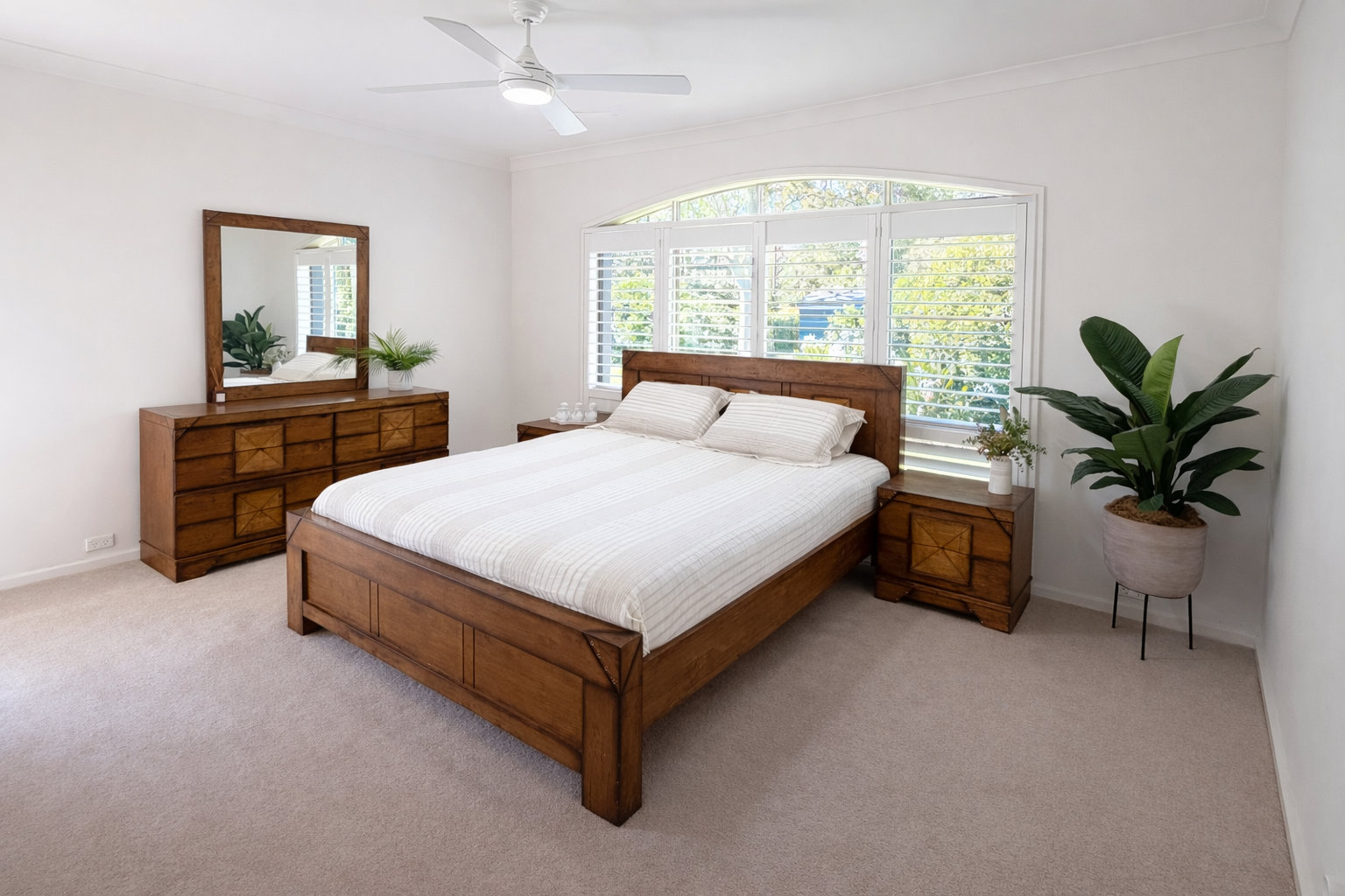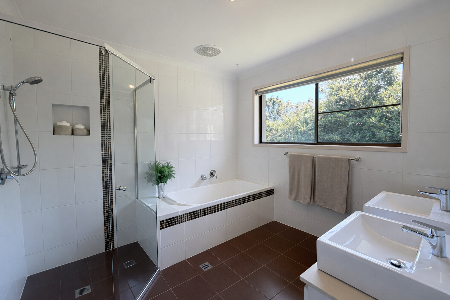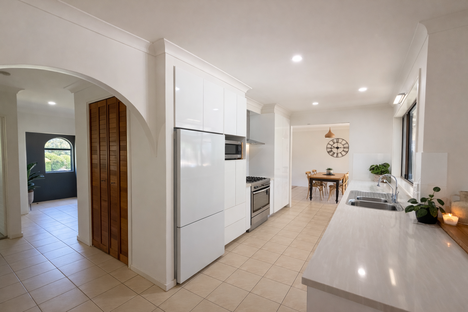 The designer kitchen is both functional and refined, featuring stone benchtops, premium appliances and generous storage. It connects effortlessly to the expansive poolside veranda, offering a relaxed setting for year round entertaining and enjoying the tranquil outlook.