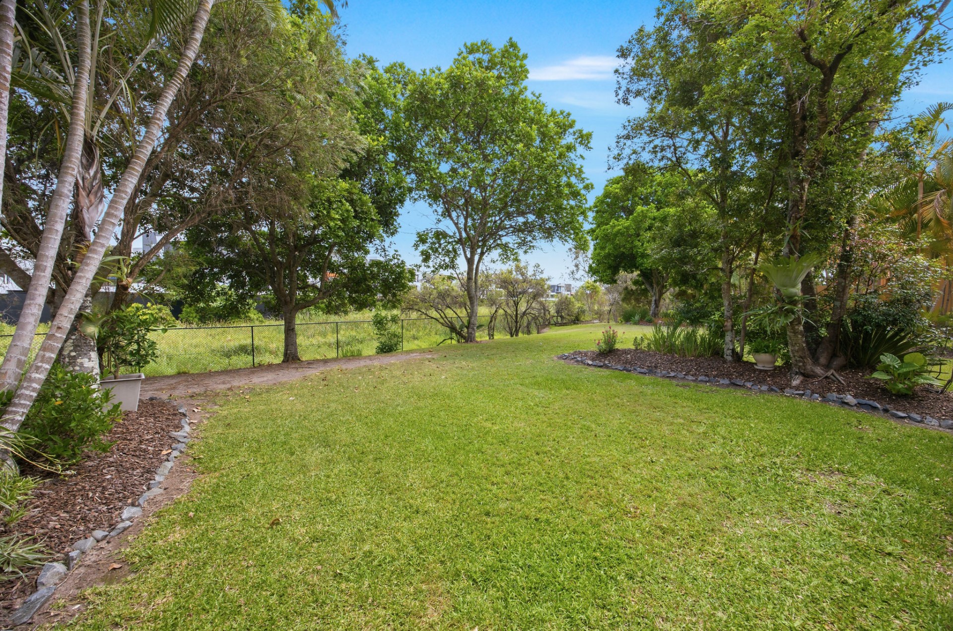 The private alfresco area, with its metal/polycarbonate gazebo for shelter and surrounded by established palms and low-maintenance gardens, creates an idyllic backdrop for gatherings or quiet relaxation. The unobstructed view from the living area and the patio, over lawn to tall trees, provides a connection with nature and an oasis of calm.