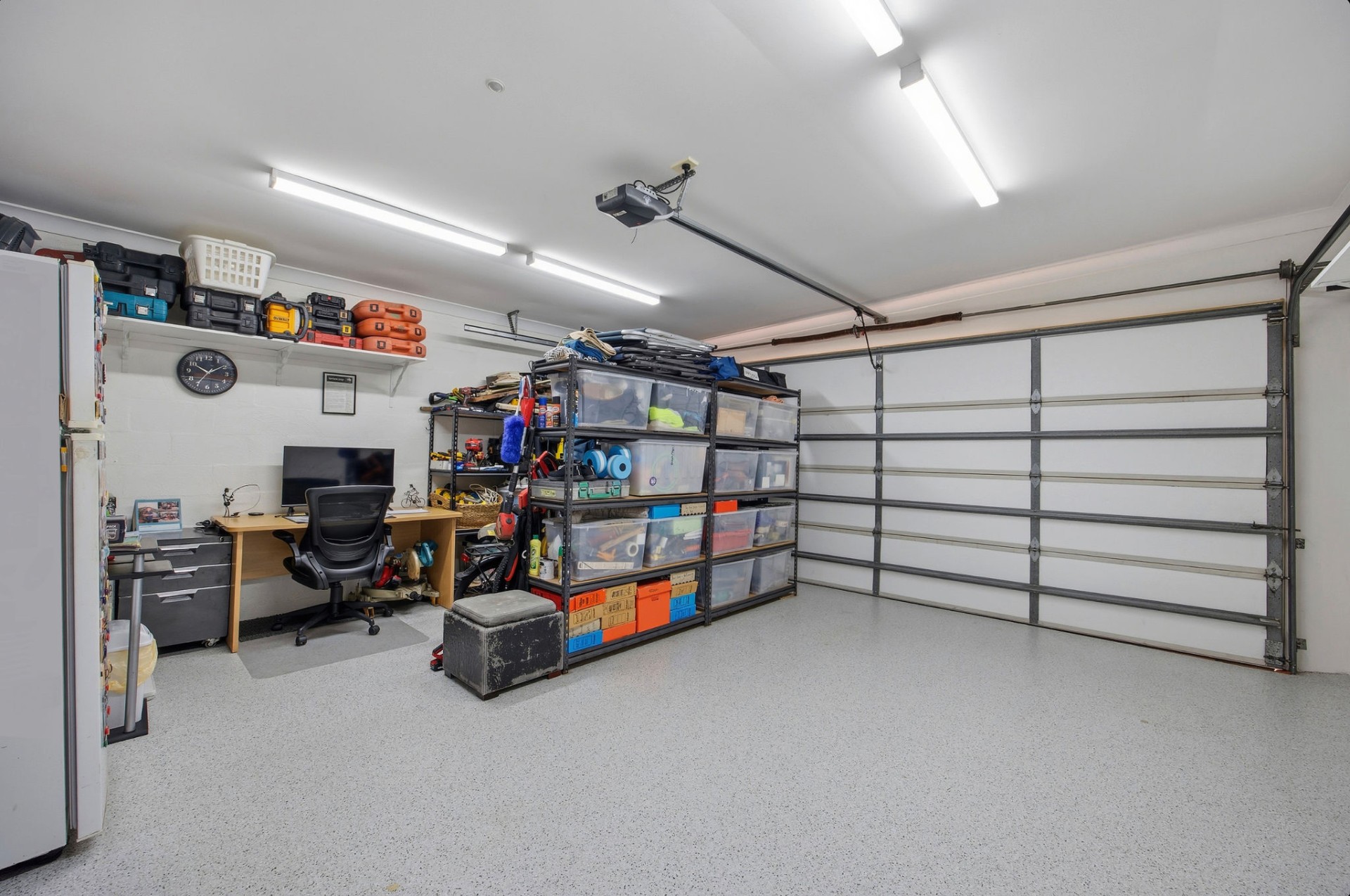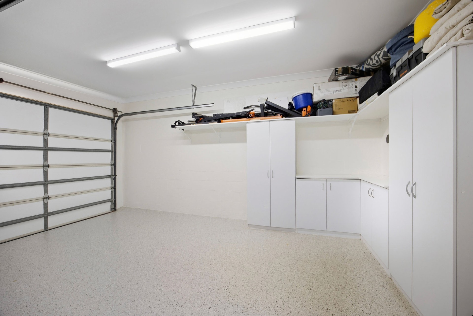 • Double garage with air conditioning, insulated motorised tilt door, terrazzo painted floor, additional lighting and storage cupboards & shelves