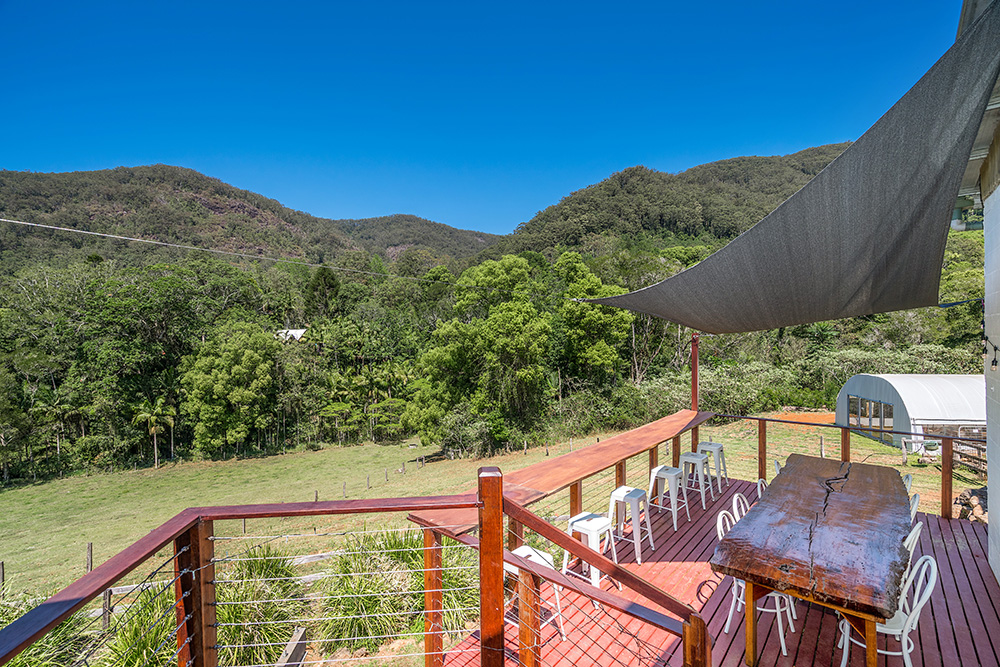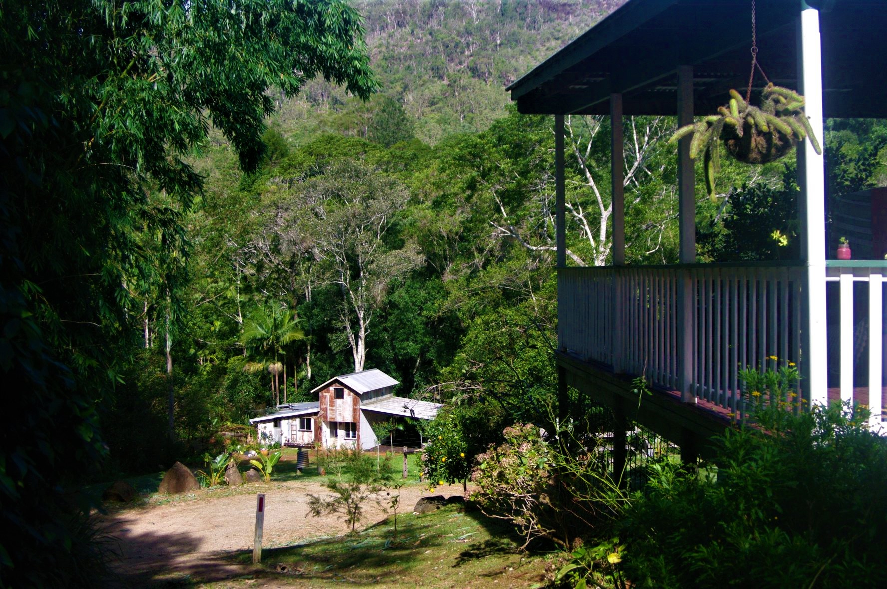 LOCATION: Approx 30 minutes from the beach at Brunswick Heads, 45min from Byron Bay, 70min to the Gold Coast or Ballina airports. 220m above sea-level, hidden in a rain forest valley , bordered by clear mountain streams and rock pools with an outlook to three surrounding National Parks.
