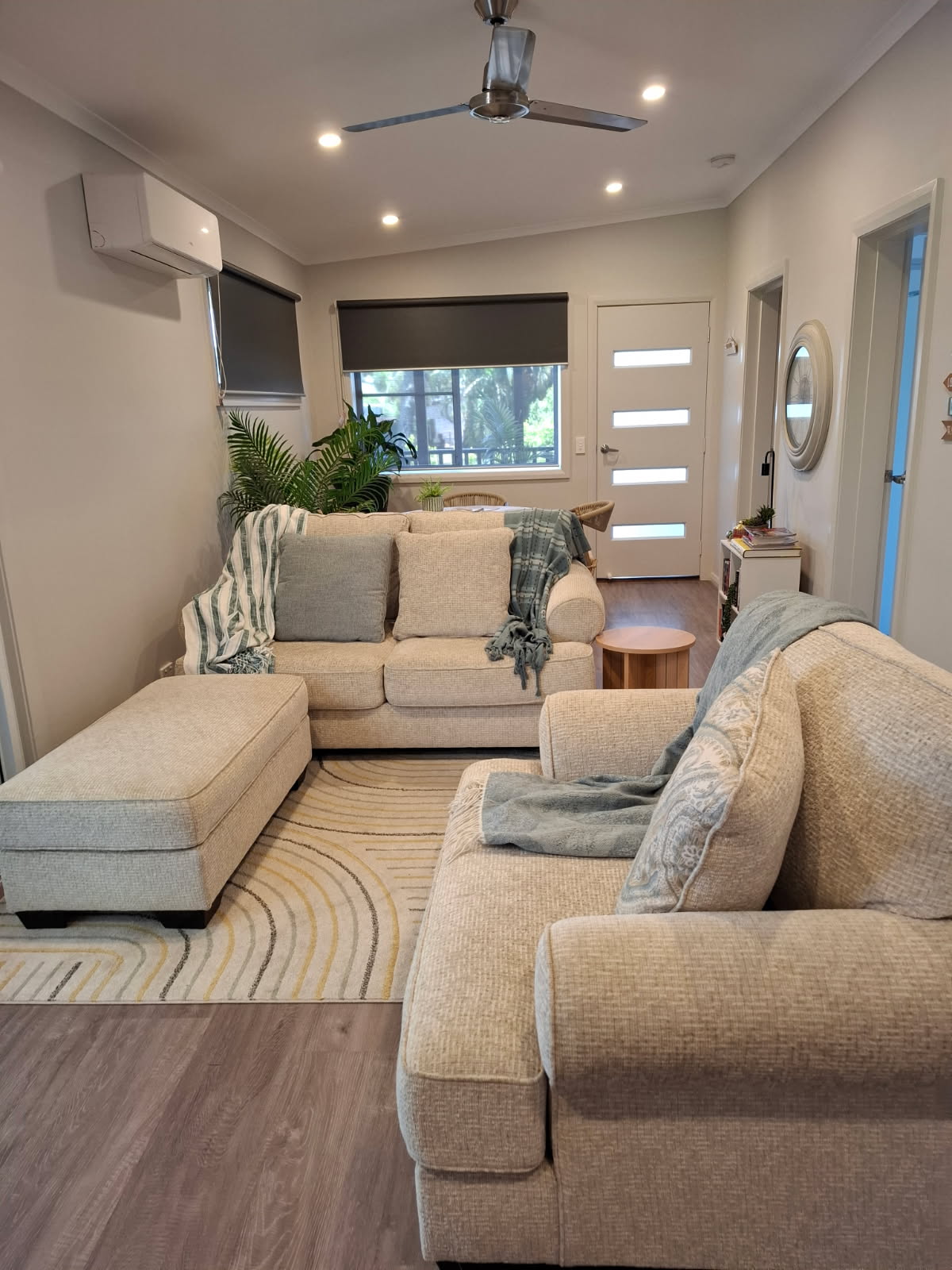 Step inside to discover a welcoming interior adorned with floorboards that exude warmth and style. The plush carpeting in the bedrooms provides a cozy ambiance, perfect for unwinding after a long day. With the added comfort of three fans and air conditioning in the lounge and main bedroom, you'll experience year-round comfort in every corner of the home.