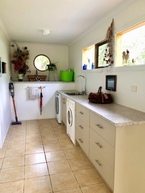 A spacious separate utility room offers large laundry sink, abundant storage, generous bench space, and inbuilt washer and dryer., with direct access to an expansive undercover back deck overlooking a private, fully enclosed landscaped courtyard.