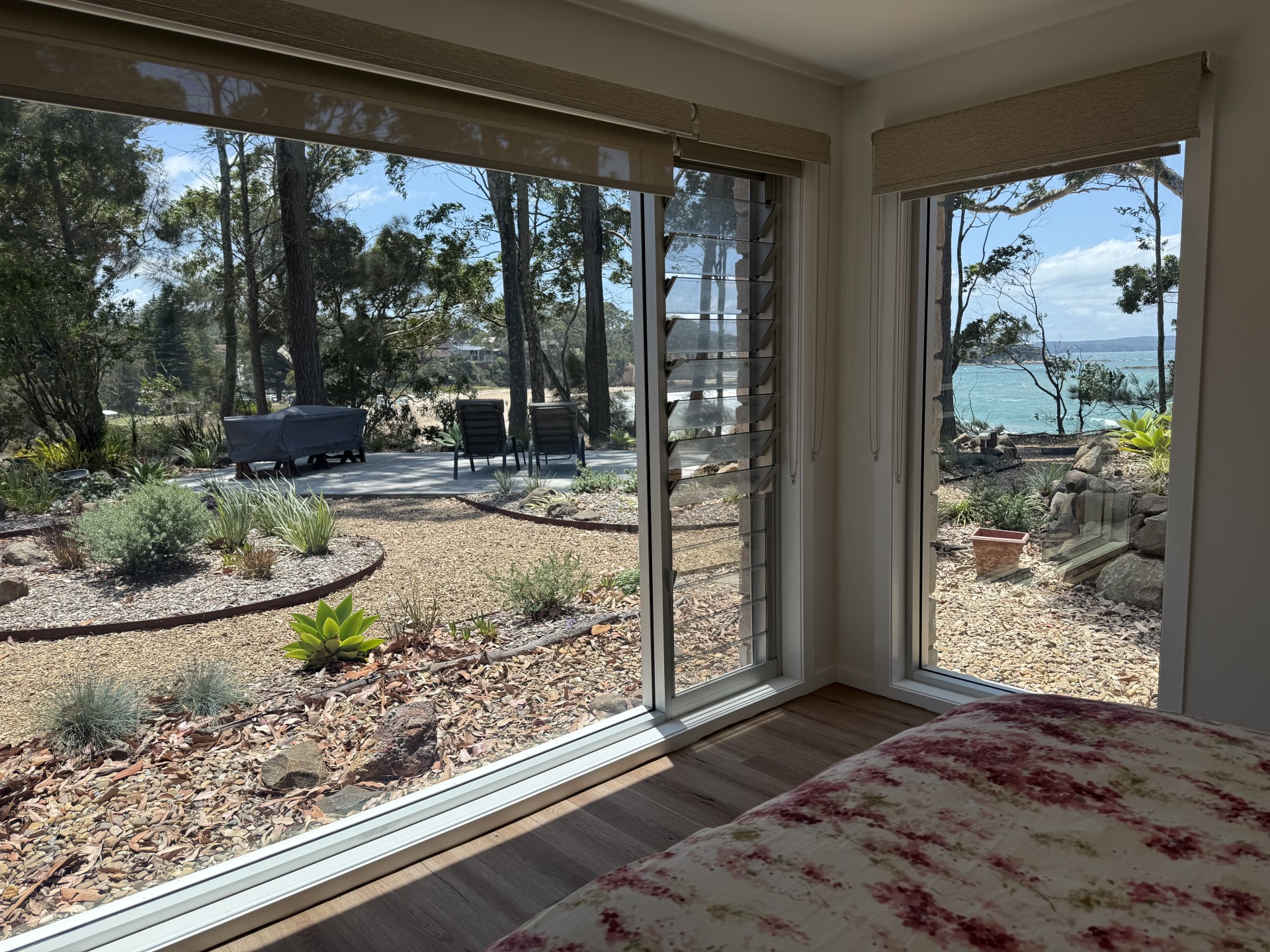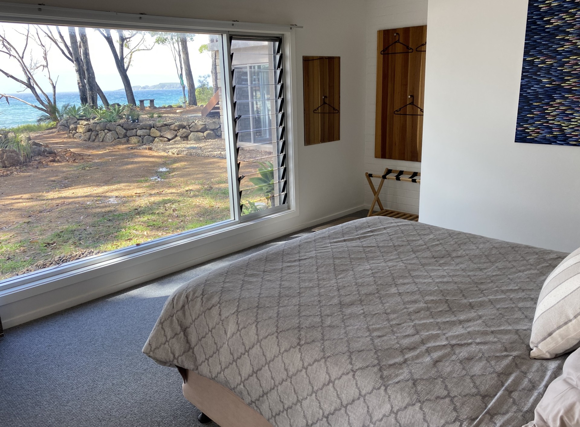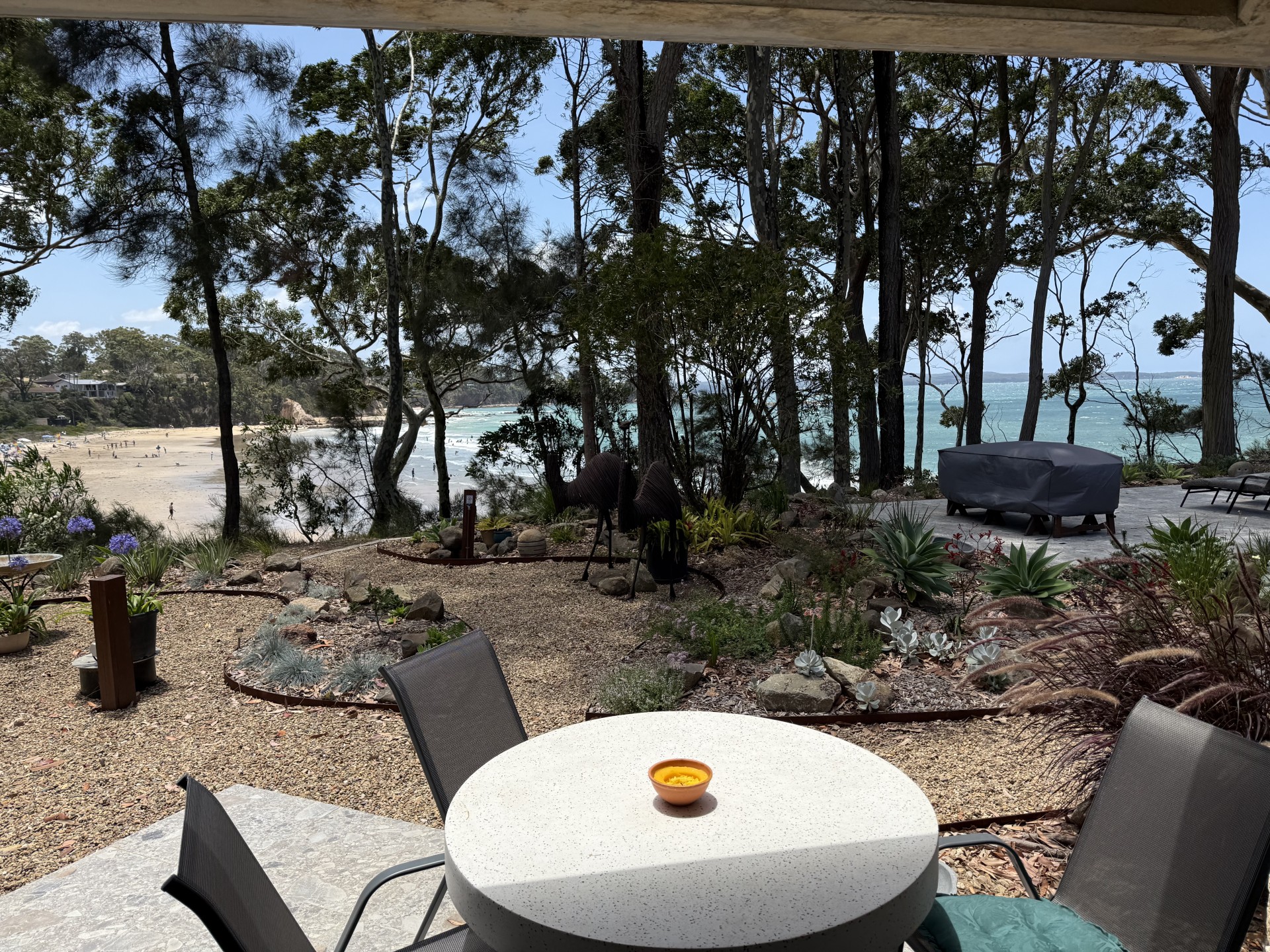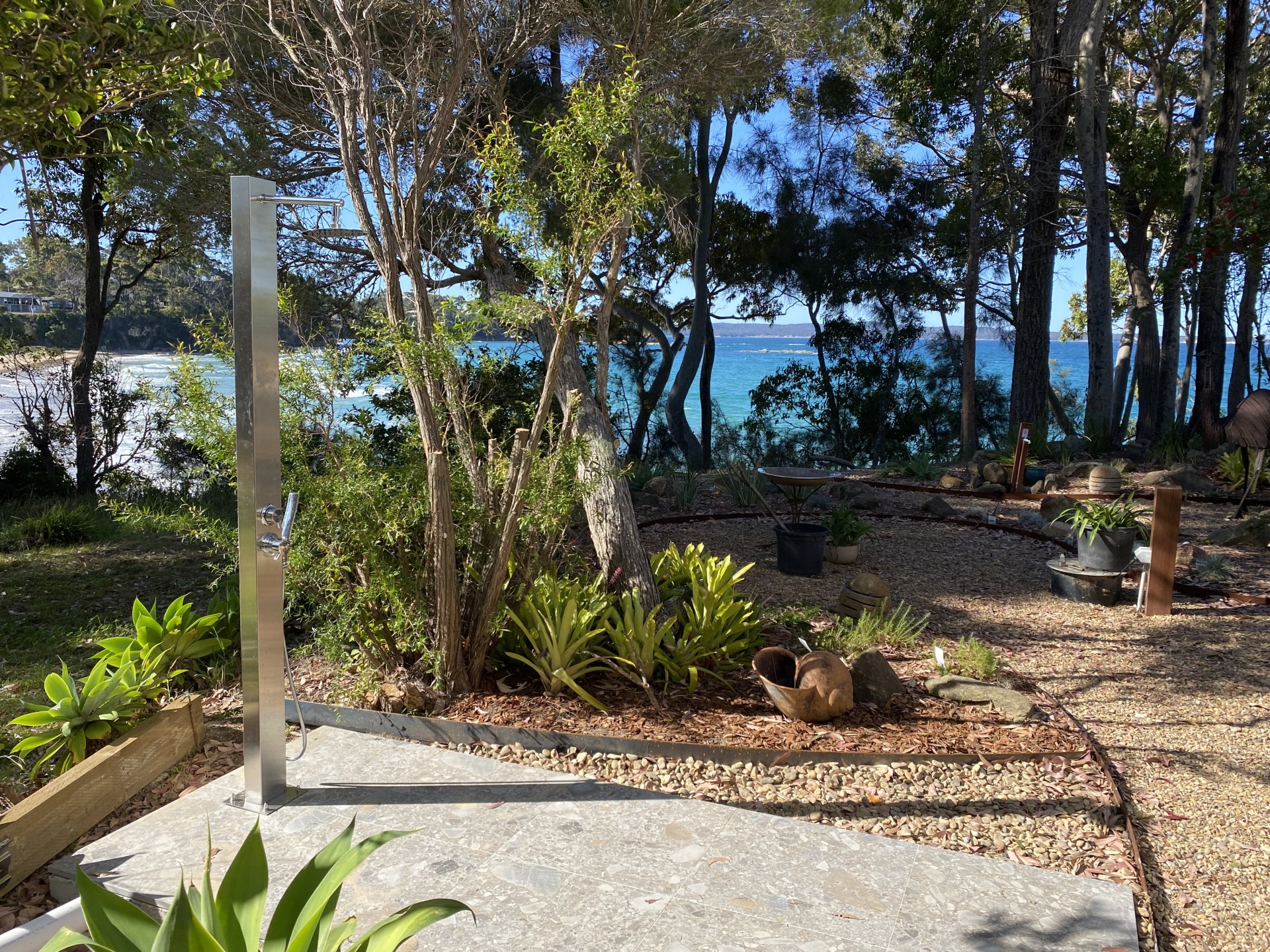 Located on the cliff between Surf Beach and Wimbie Beach, enjoy the unique 50m direct beach access to Surf Beach, uninterrupted beach and ocean views, breaking surf, bird songs, magical sunrises, outside seating and relaxation areas, and evening-lit bushland garden.