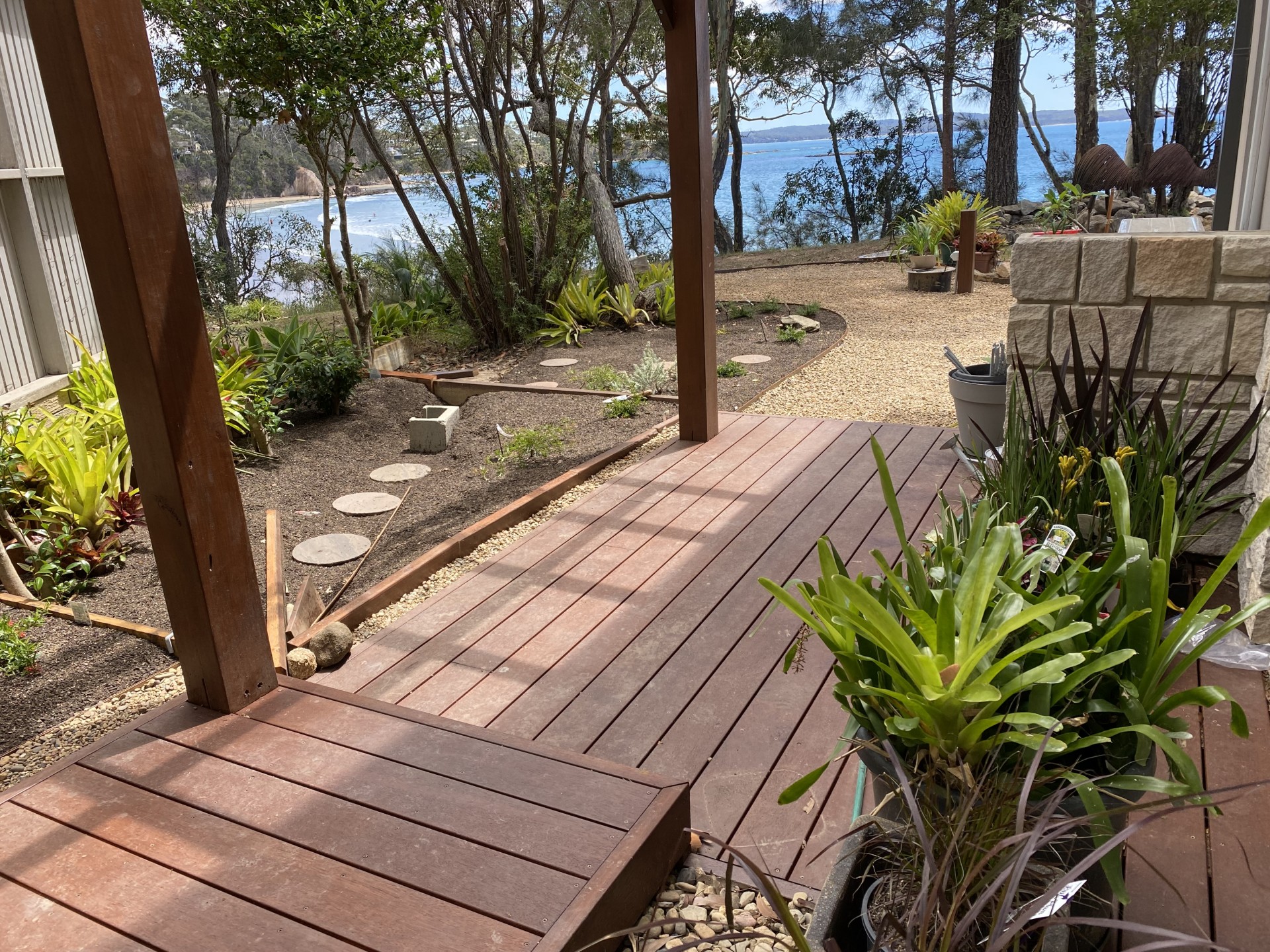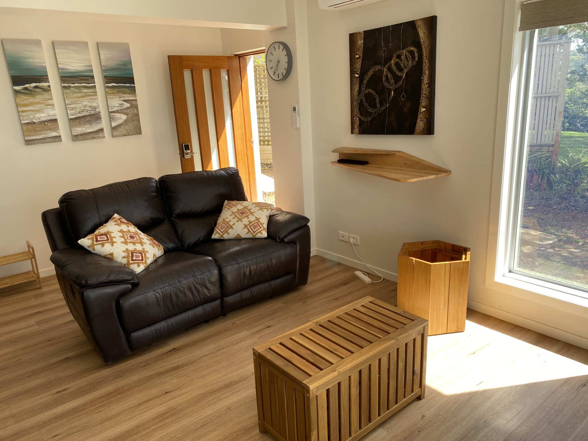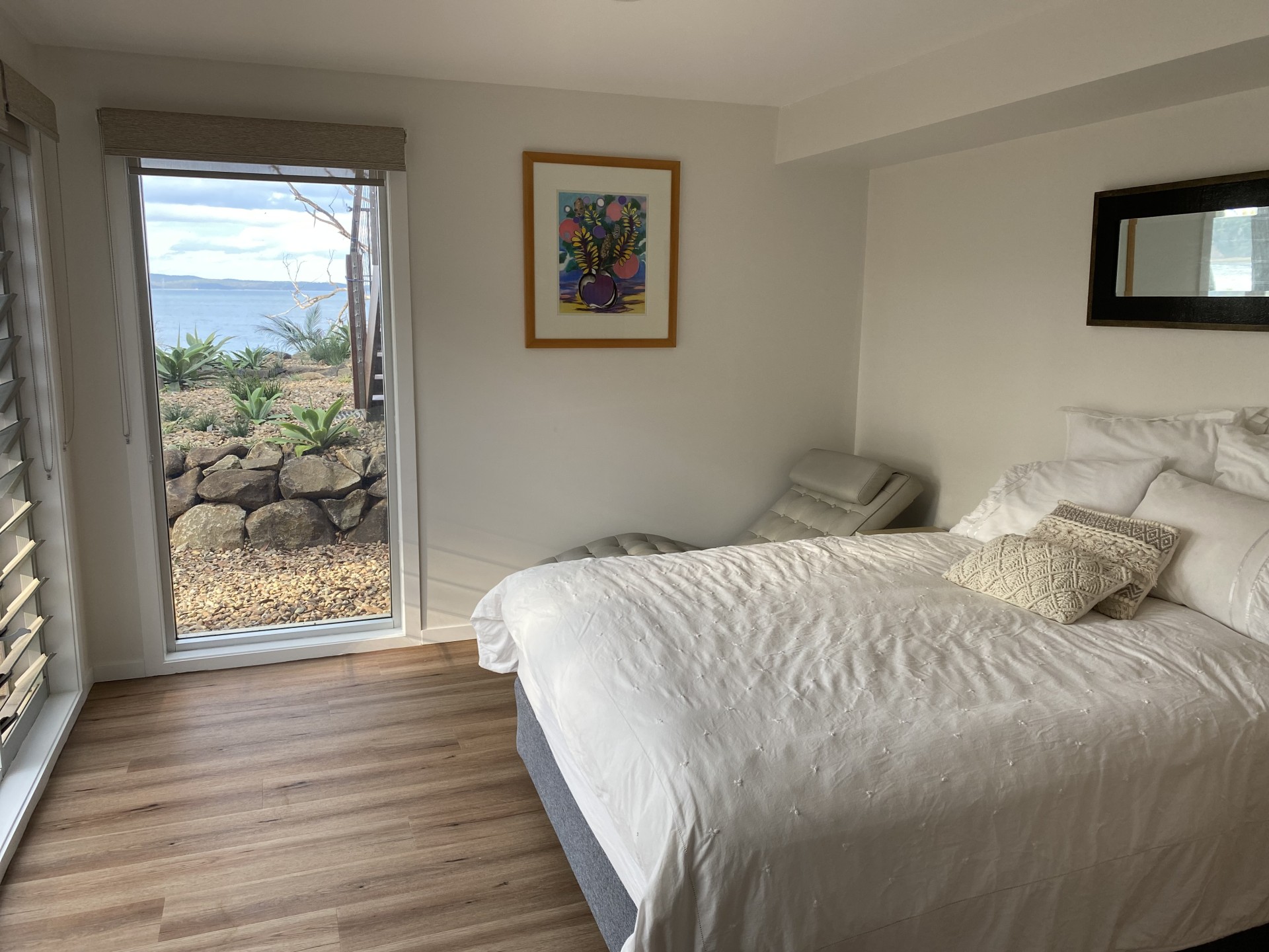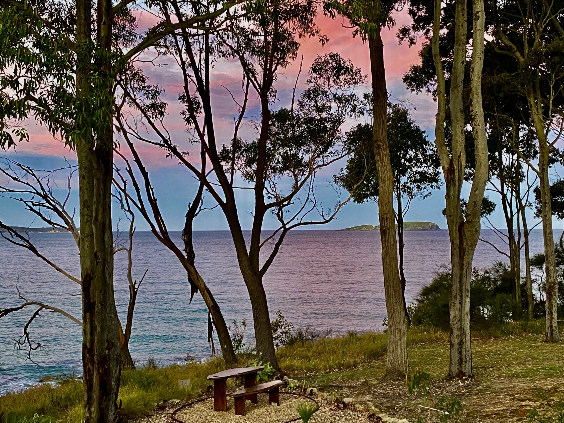Located on the cliff between Surf Beach and Wimbie Beach, enjoy the unique 50m direct beach access to Surf Beach, uninterrupted beach and ocean views, breaking surf, bird songs, magical sunrises, outside seating and relaxation areas, and evening-lit bushland garden.