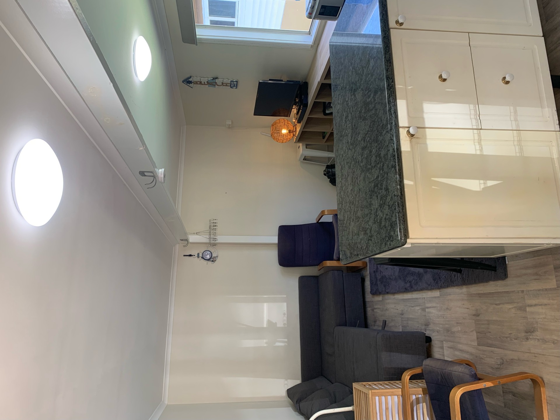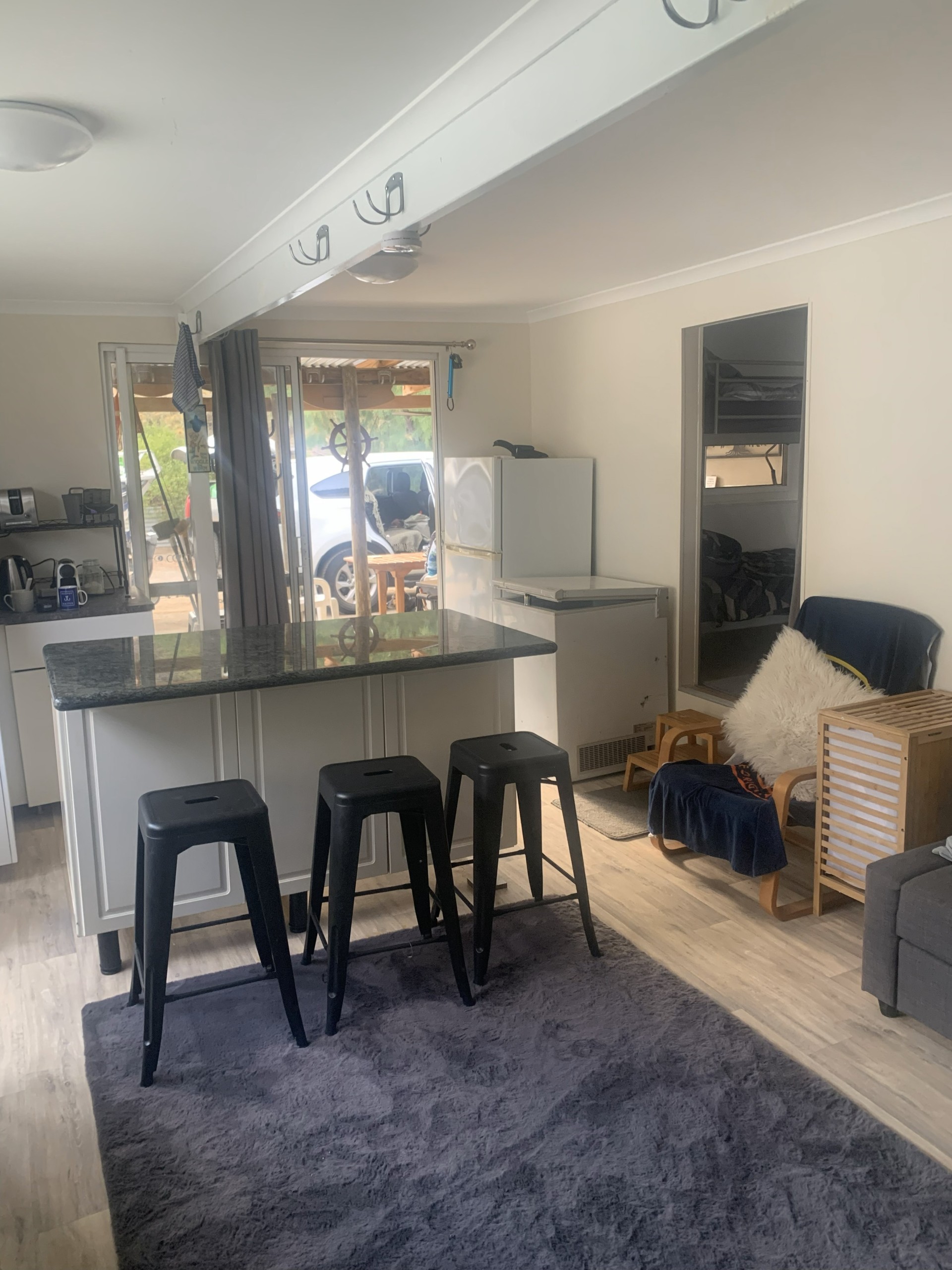 The open plan living area has a queen size sofa bed plus two rocking chairs, TV, open plan kitchen with mini oven, microwave, kettle and toaster, fridge freezer and chest freezer, water cooler, kitchen island/breakfast bar with 5 bar stools and portable refrigerated air conditioner.
