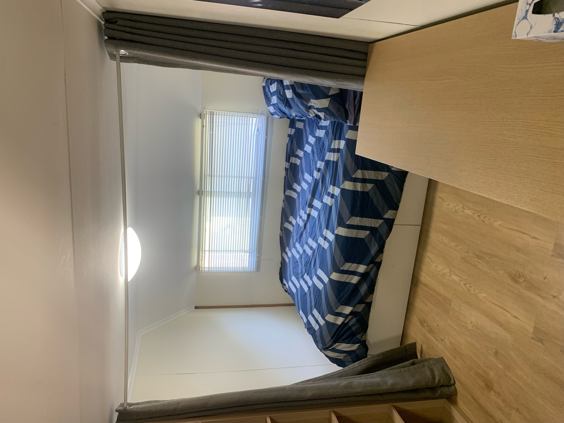 The home has two sleeping areas with a curtain divide. One side has a double bed and the other side has bunks. This room has lots of storage with a cube storage system, underbed storage and an extra large 6 drawer dressing table.