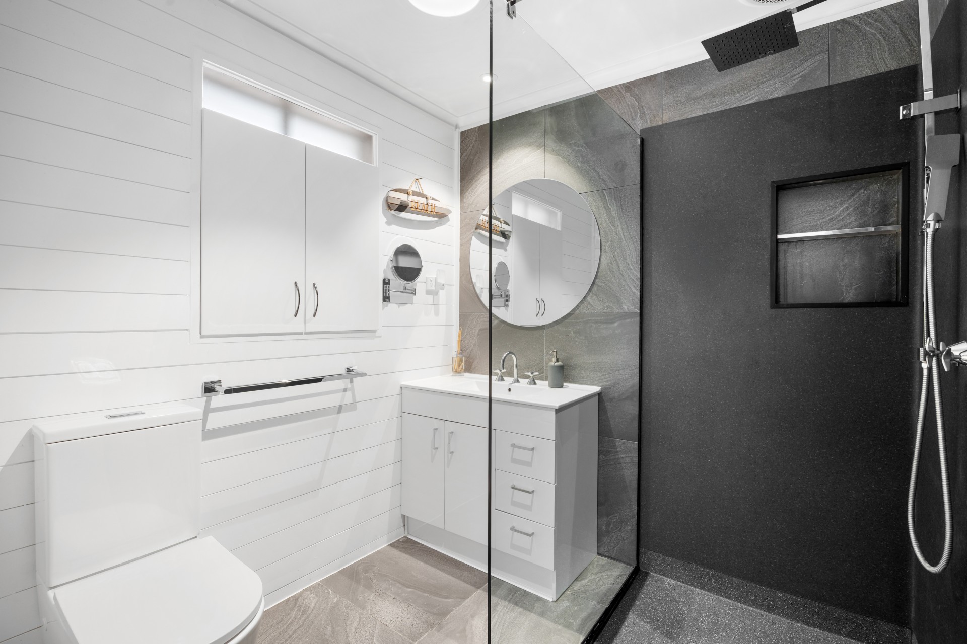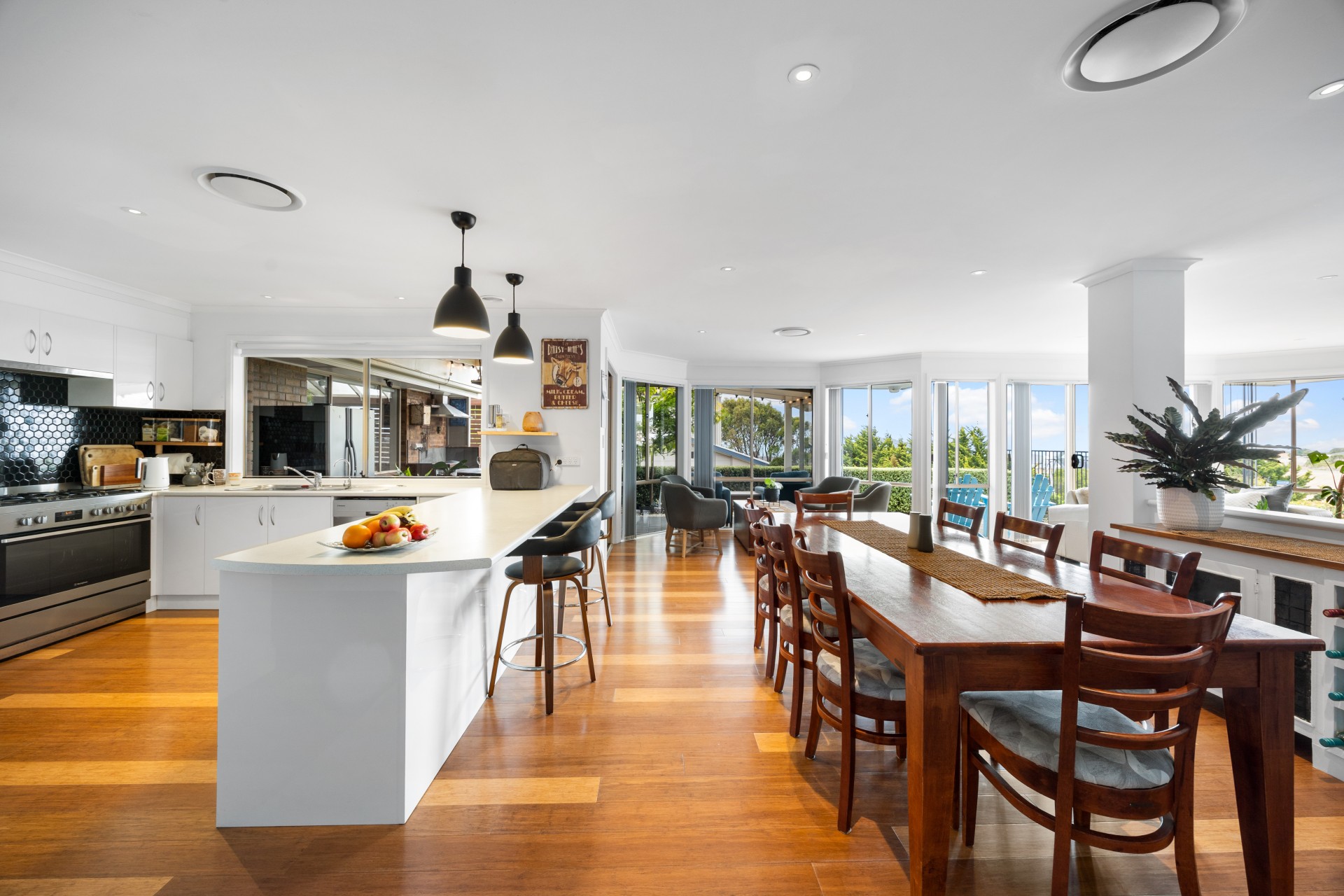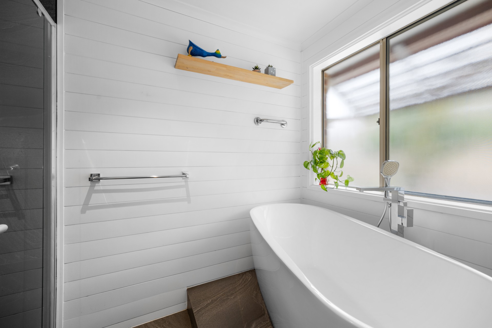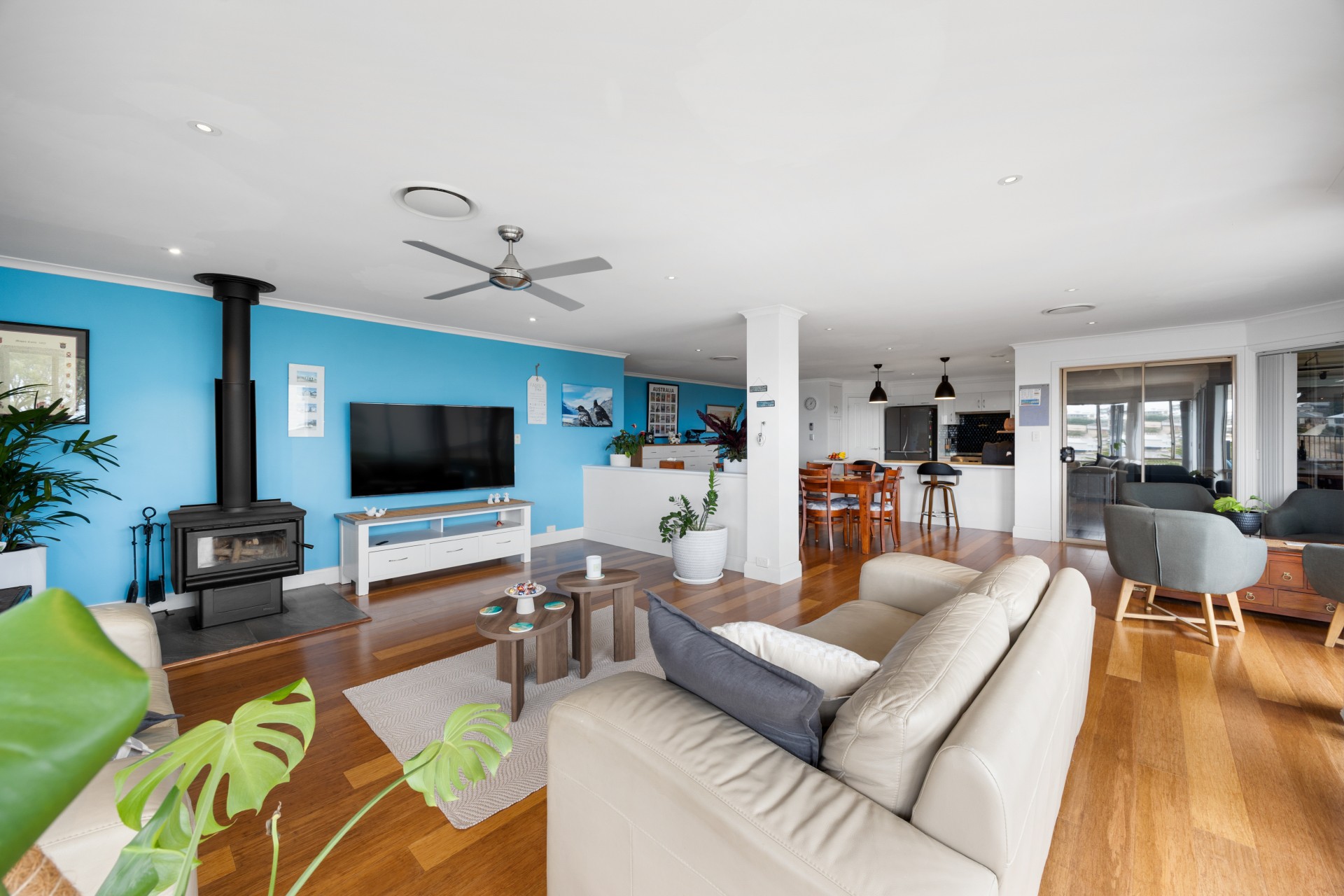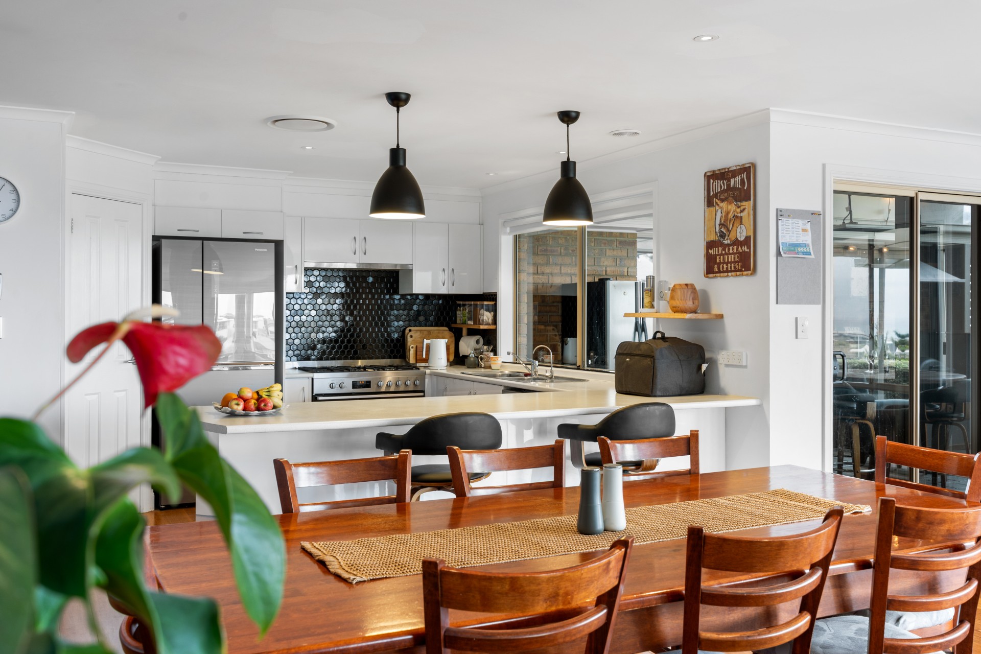 Designed for modern living, the home features an open-plan kitchen, dining, and living area that seamlessly connects to the outdoors. The well-appointed kitchen boasts a 900mm gas cooktop with electric oven, ample storage, and generous bench space, overlooking the outdoor entertaining area. The adjoining dining zone easily accommodates an 8-10 seater table, while the lounge offers the warmth of wood heating for cosy winter nights.