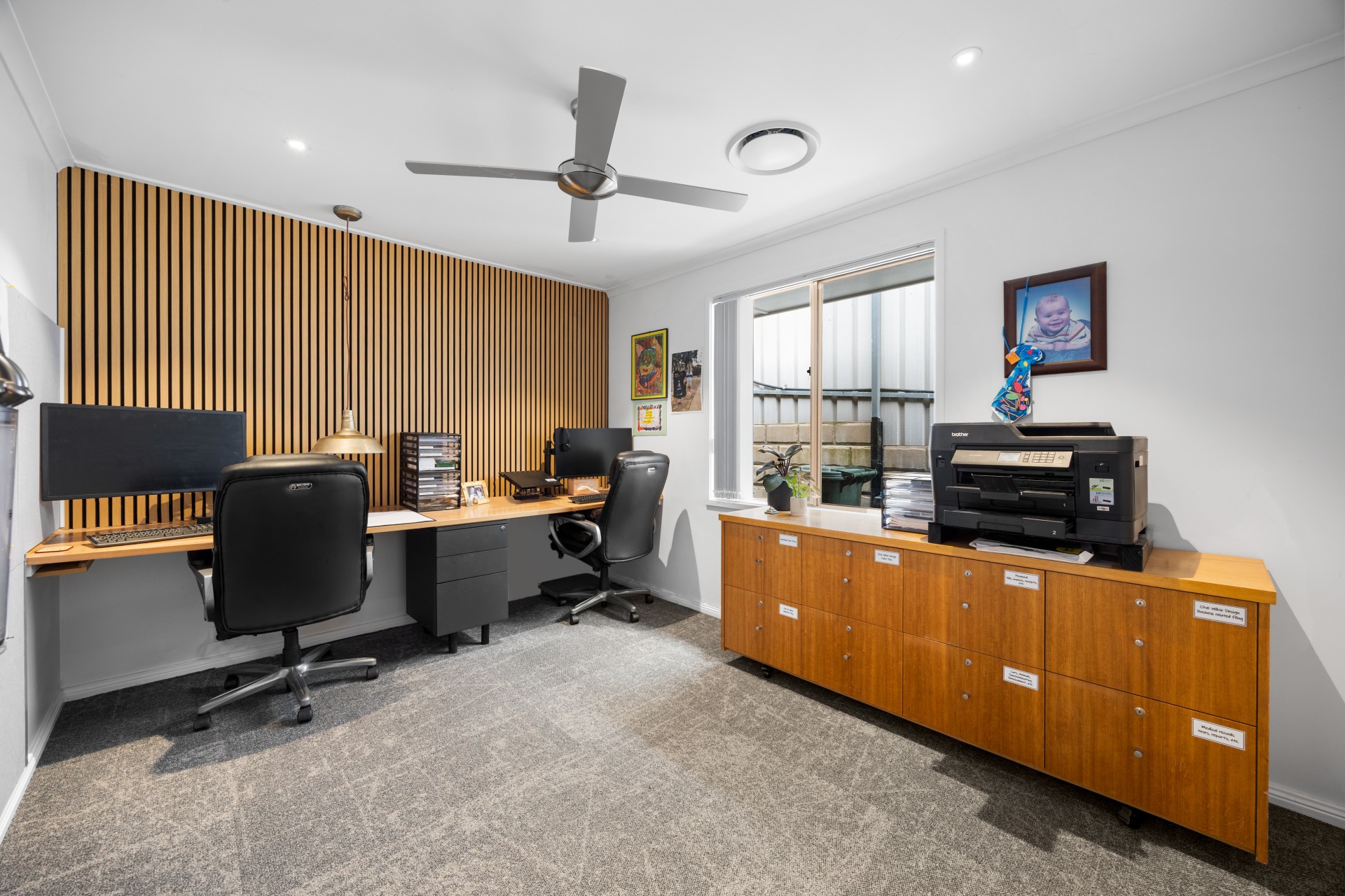 All four bedrooms are generously sized, with the fourth currently utilised as a home office and connected to fibre-to-the-premises NBN. The master suite includes a walk-in robe and private ensuite. The family bathroom offers a bath, shower, separate vanity, and WC, complemented by a well-equipped laundry with additional storage and external access.