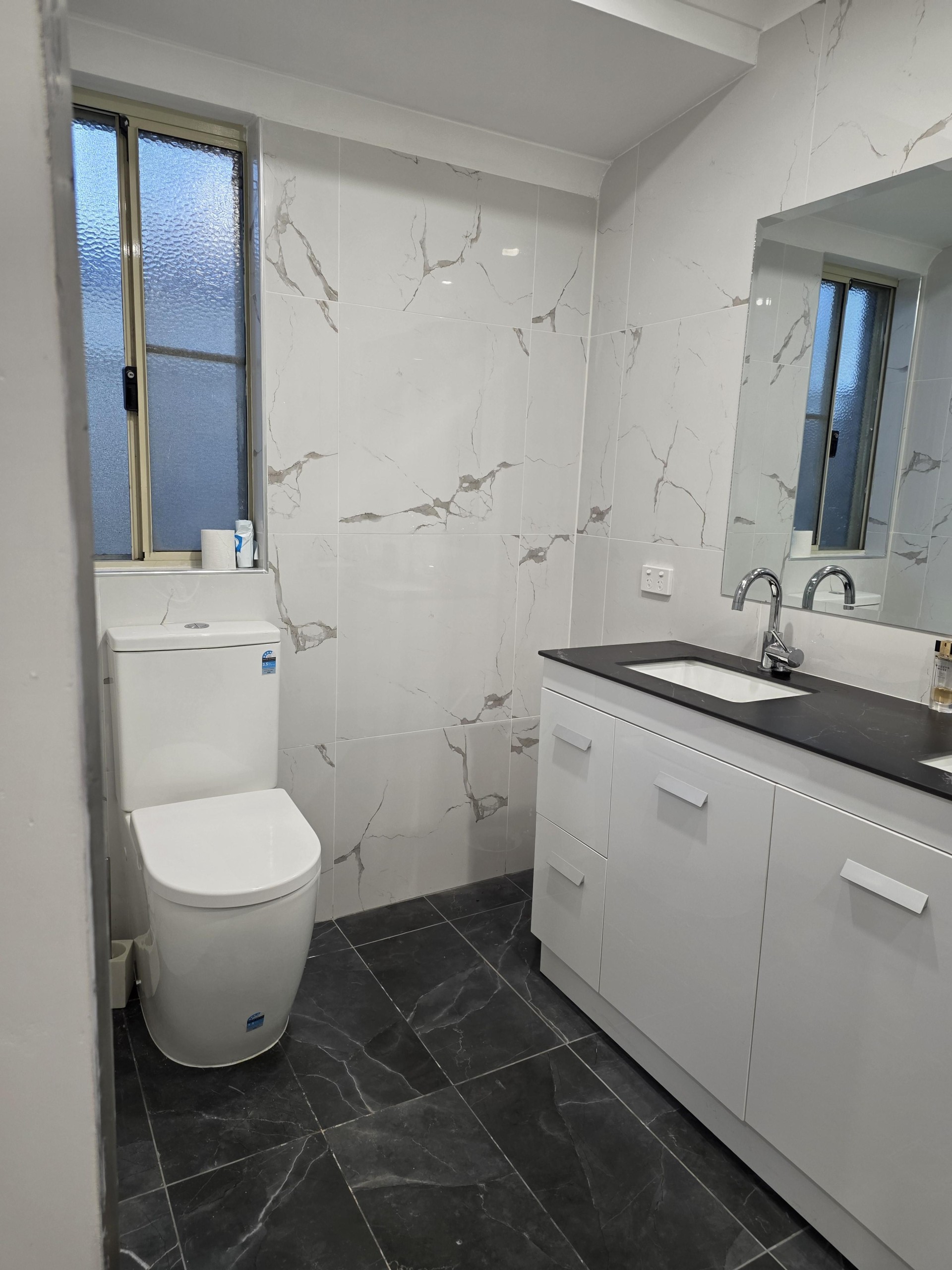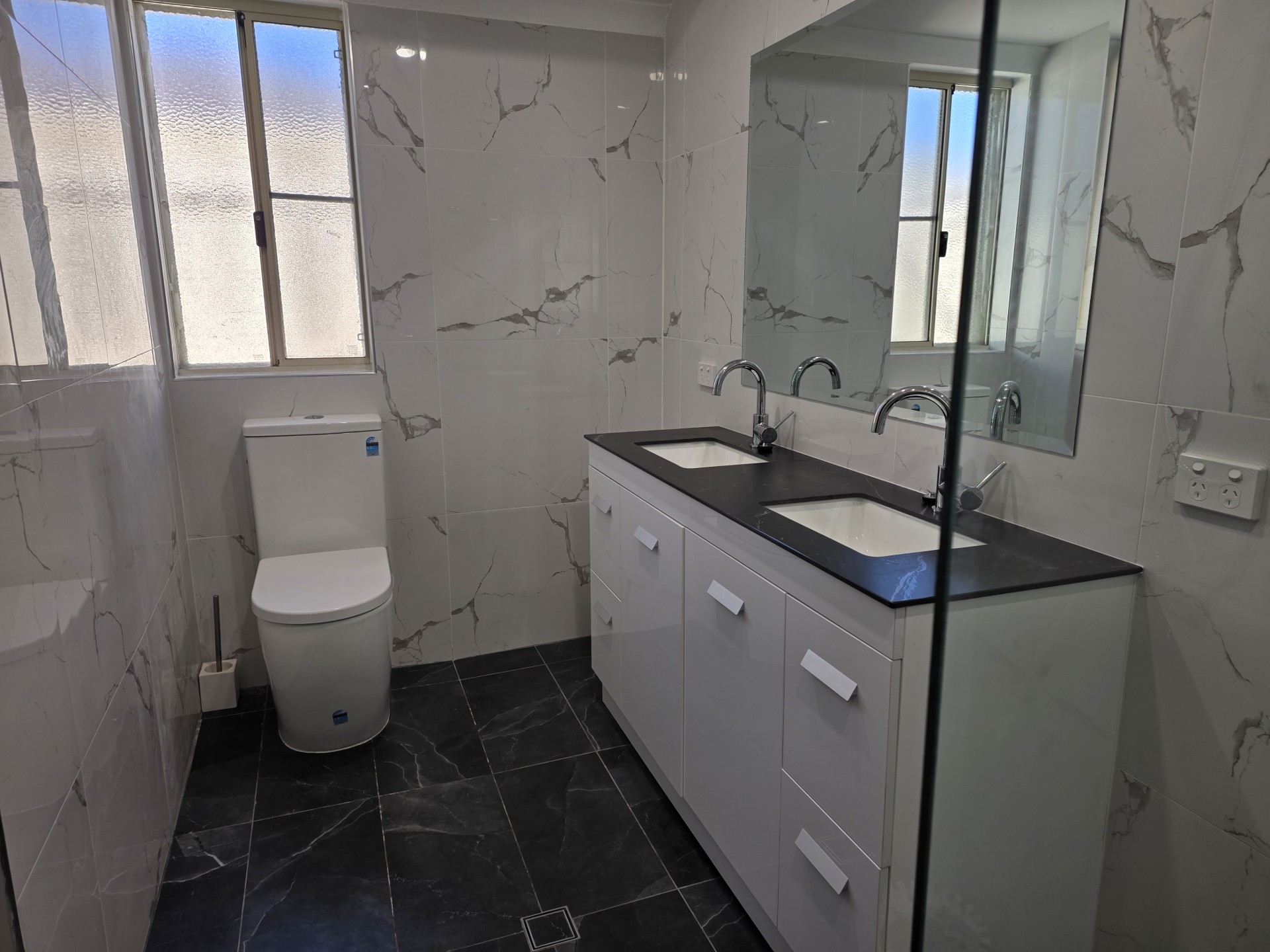 Laundry with side garden access has been modernised, tiled to the ceiling, with a new vanity and WC