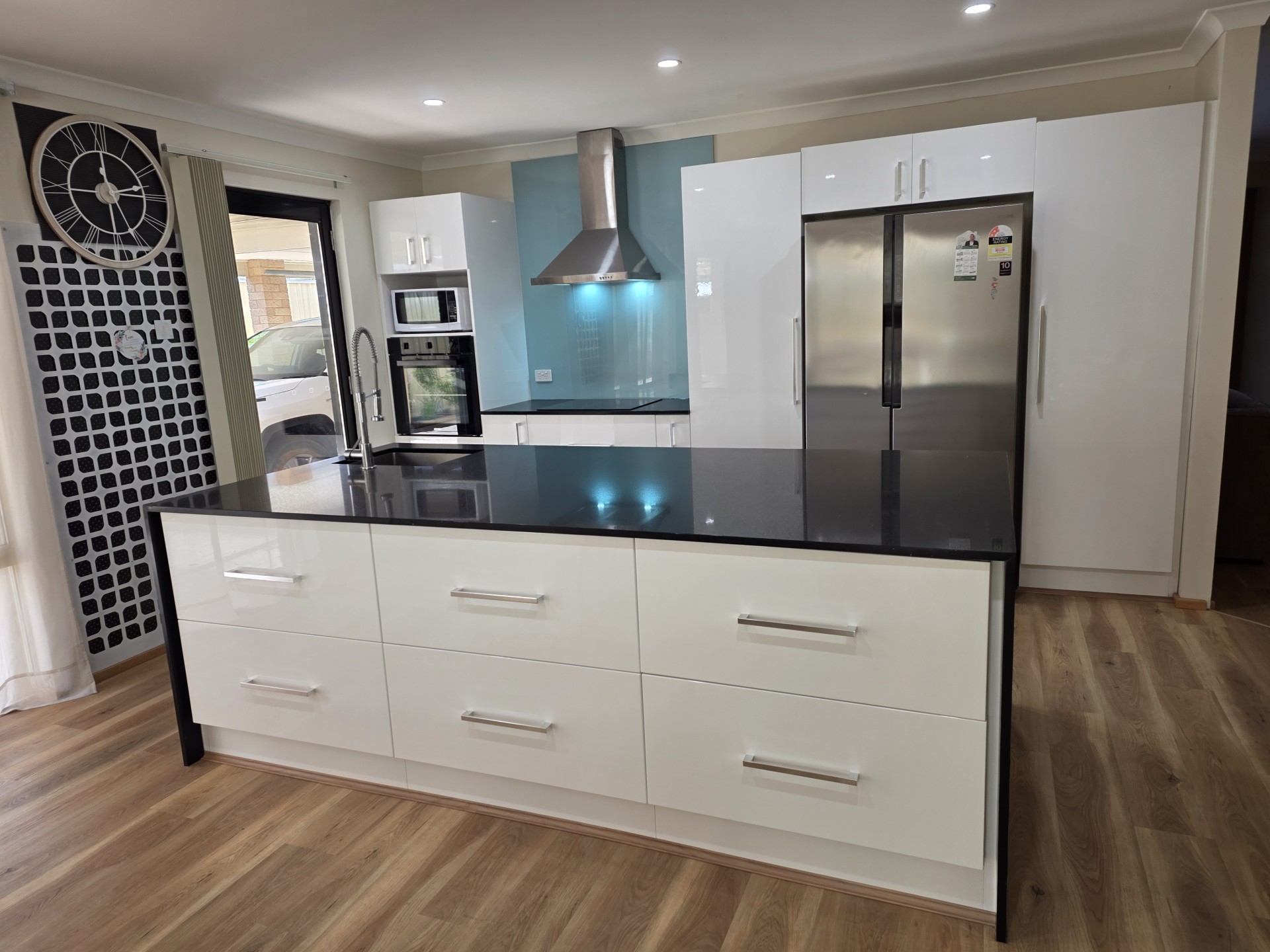 The new kitchen is a centrepiece overlooking the family living space, with two built-in pantries and many drawers.