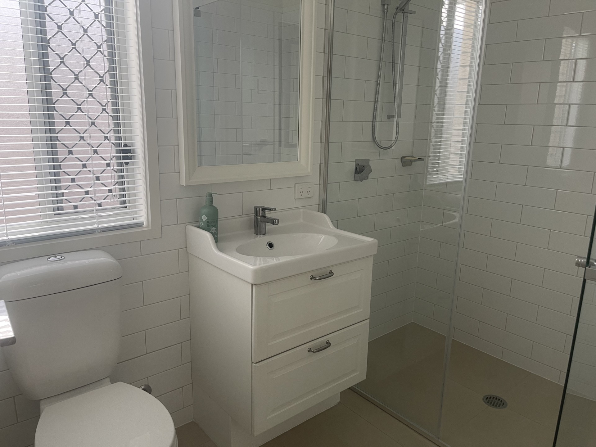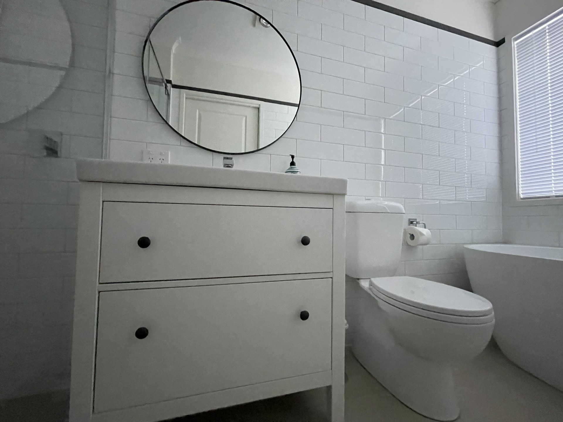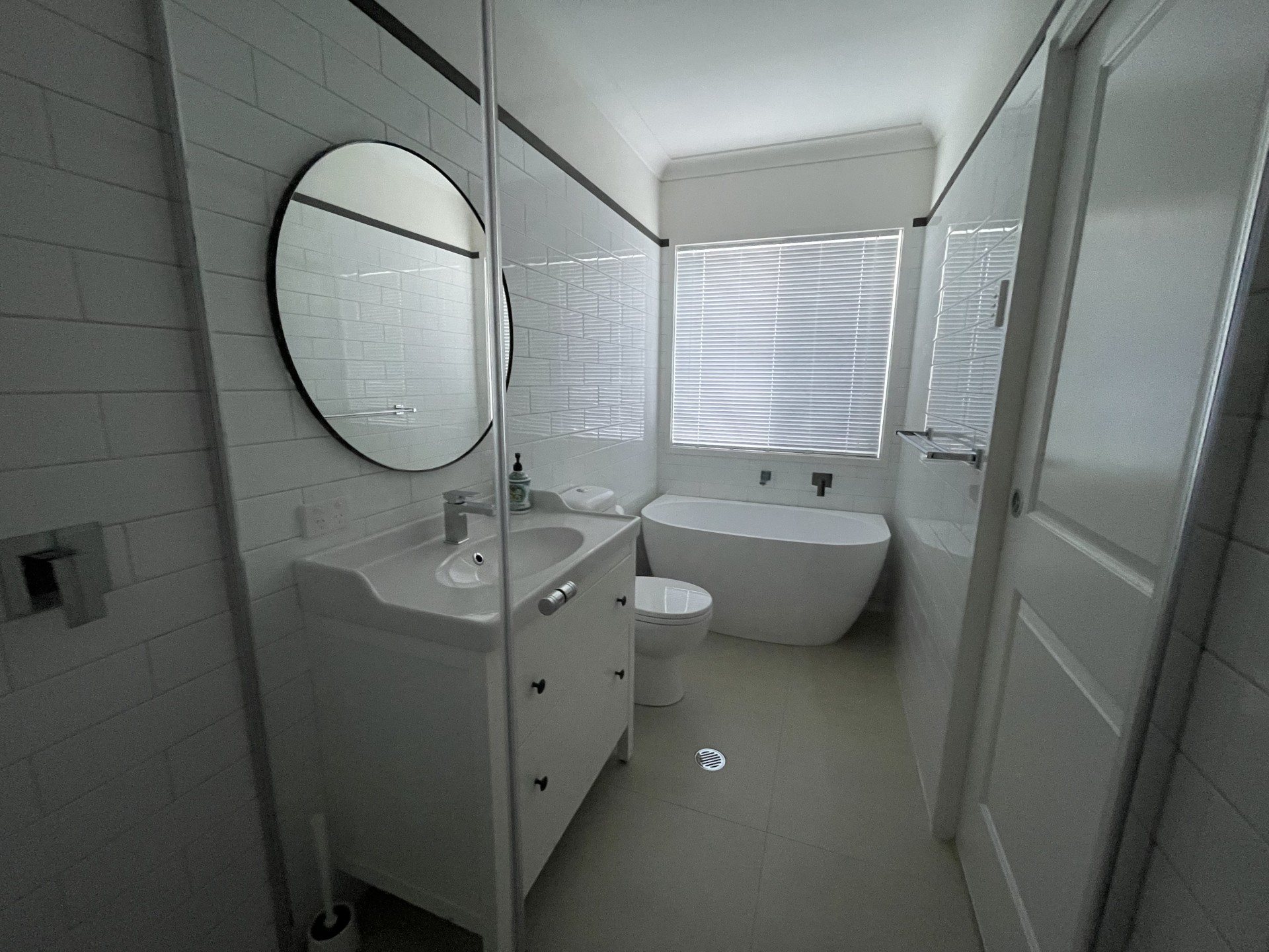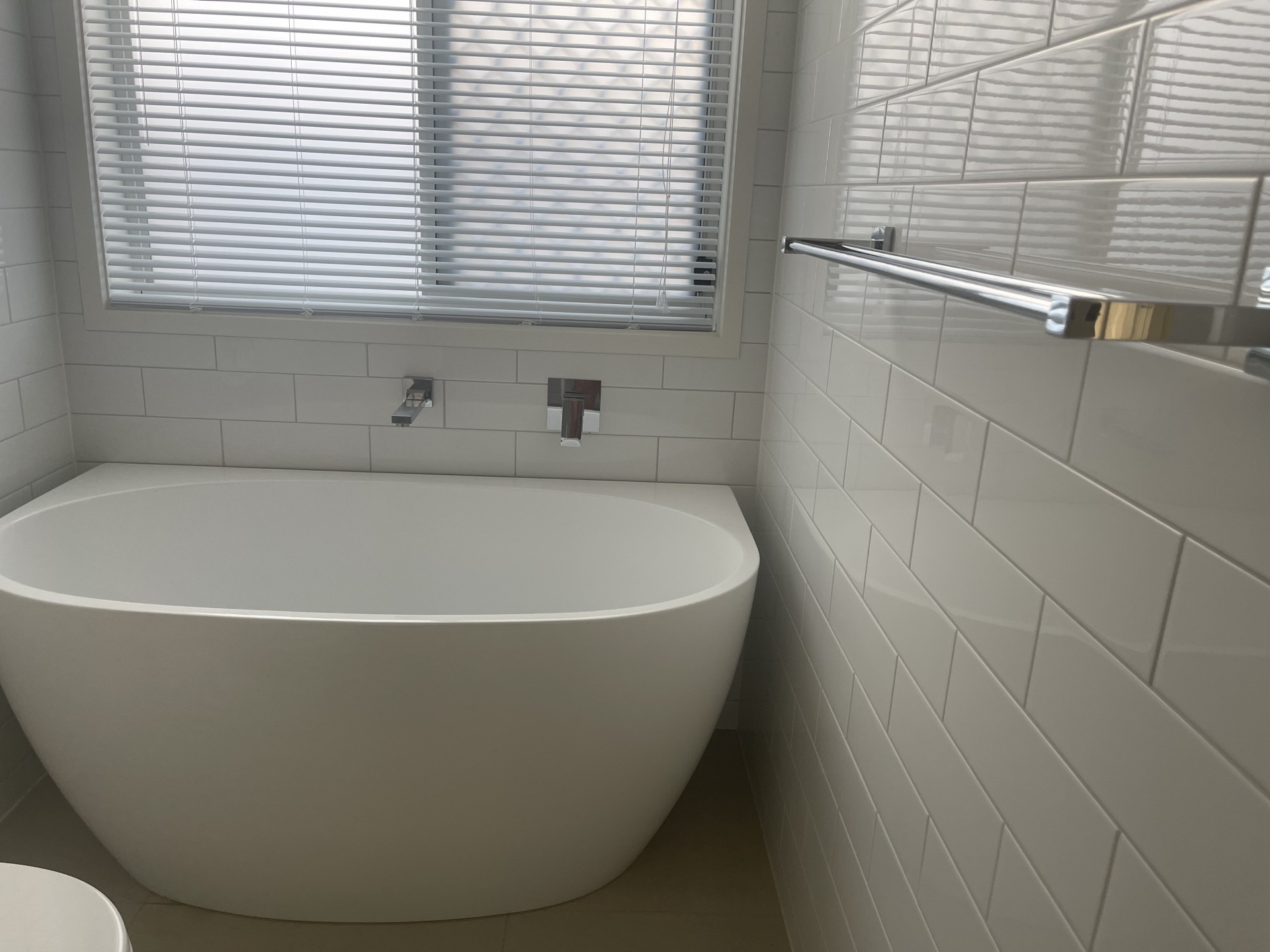 Pendant lights, and extensive in-vogue robes, add pizazz to the decor of the Master Suite. With a window opening onto the back Patio, your privacy is ensured. The Ensuite is tiled to door height all the way round, in a modern subway tile. A large glass shower, vanity with drawers, a gorgeous free standing bath, a fan and heat lamps, all turn your bathroom into a resort spa.