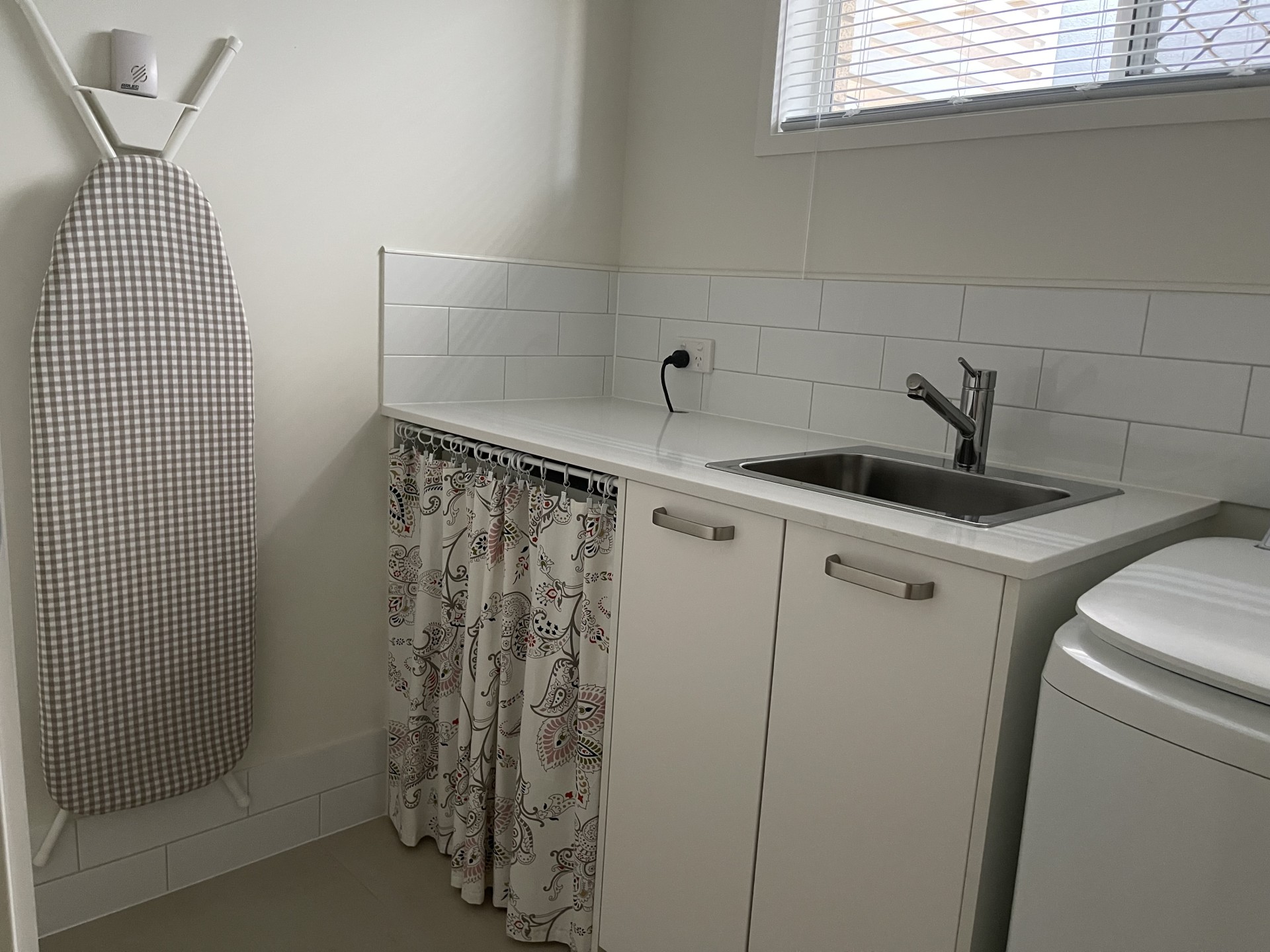 Internal with a designated place for washer and dryer. Other features include: a stone bench top, stainless steel sink, internal clothesline and attachment to hang an ironing board.