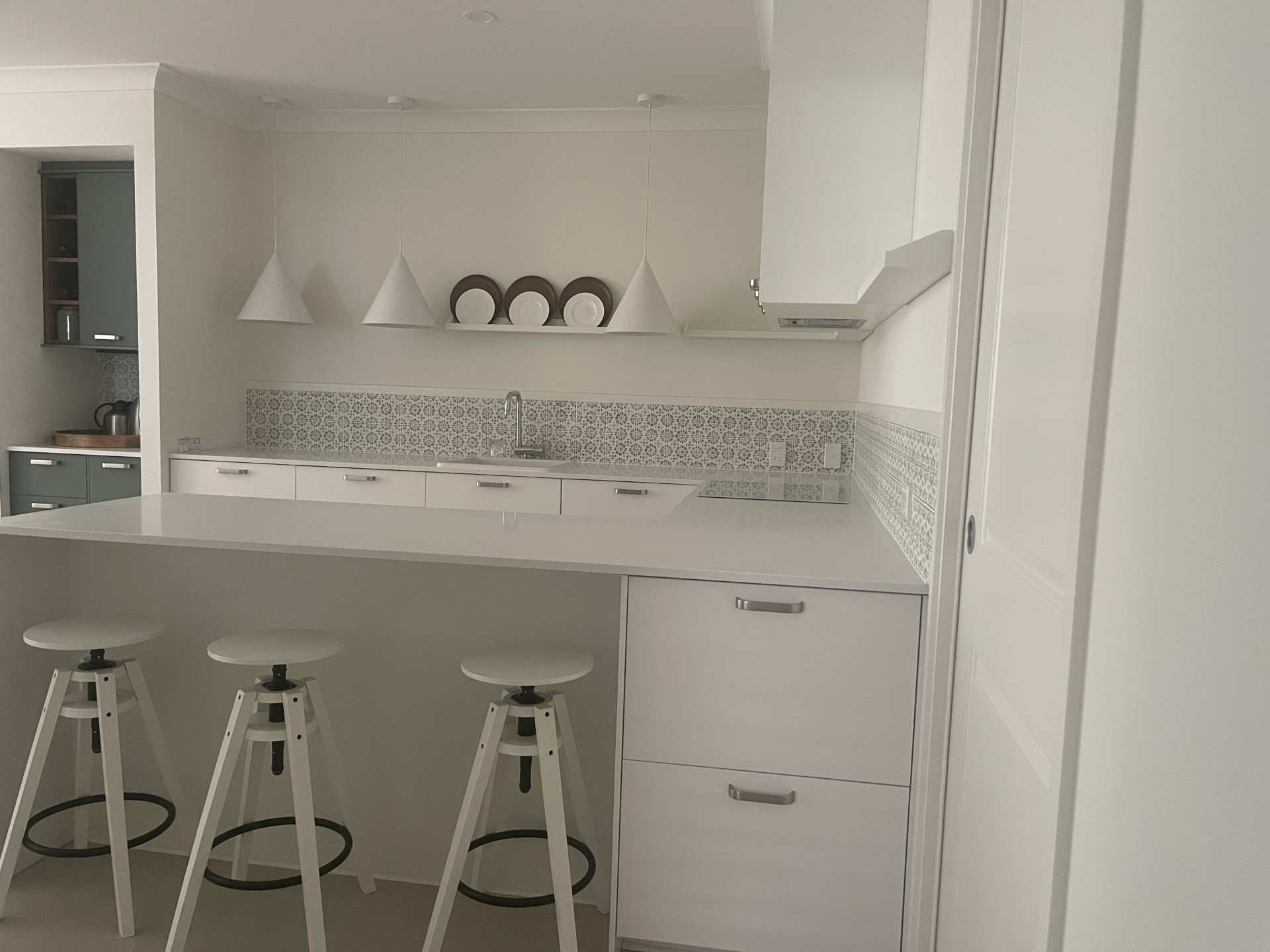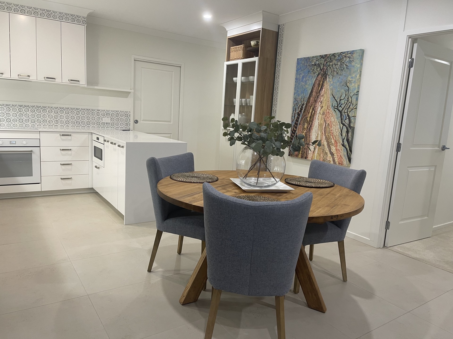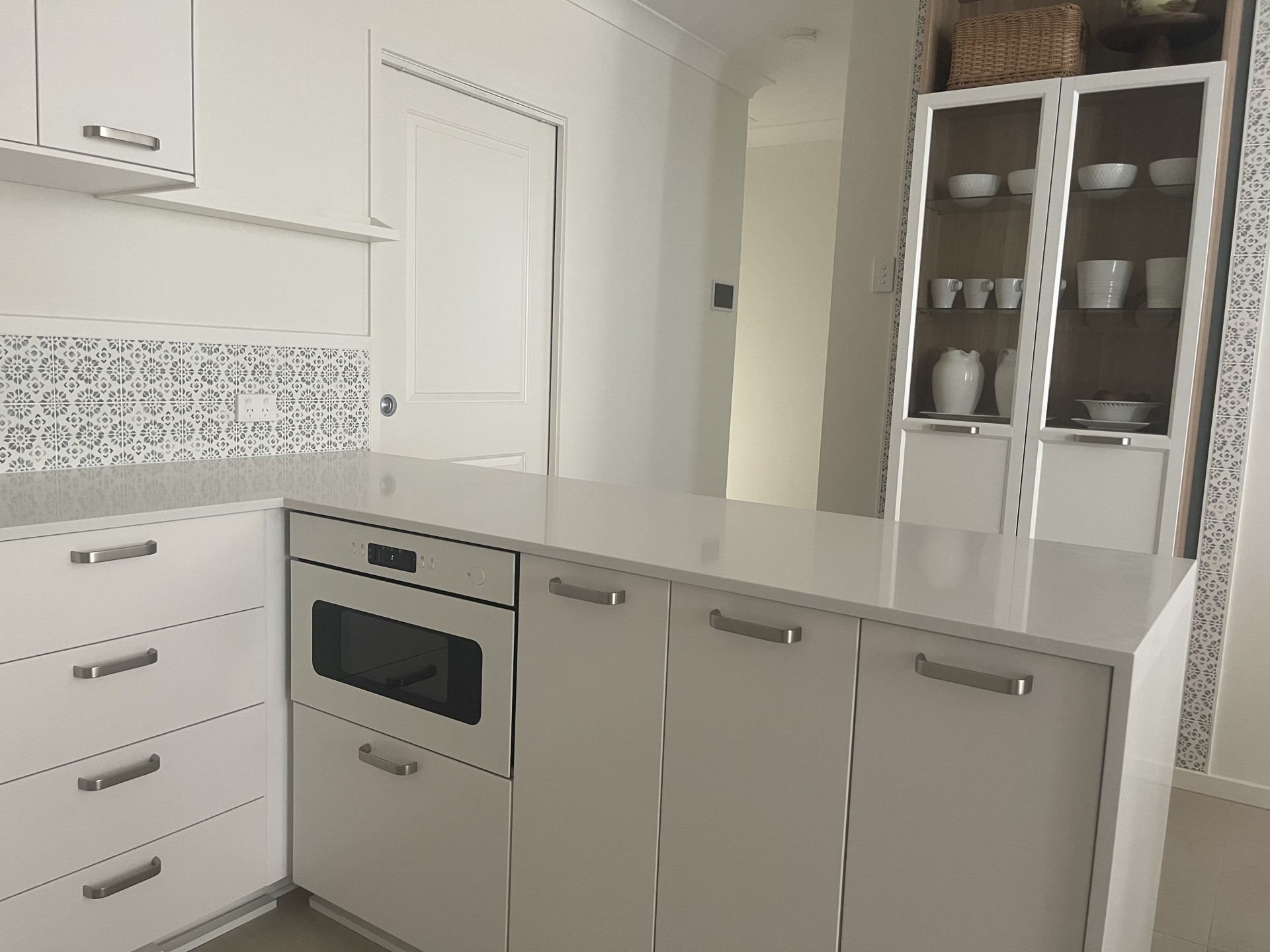 The area boasts 600 x 600 neutral floor tiles and opens up onto the enclosed Patio. Provision is made for a wall-mounted TV as socket and power point is installed. A gorgeous, trendy green, custom-built, coffee/wine cabinet has your drinks all sorted when you are entertaining. A plumbed fridge recess abuts the drinks cabinet. The dining area comes complete with breakfast bar, stunning wall - mounted cabinet with tile trim, and space to hang a fabulous piece of wall art. The kitchen is the real hero of this area as it oozes character. Elegant pendant lights illuminate your bench space. A charming wall tile coupled with dreamy white cabinets and stone bench tops, turns your cooking area into a modern country kitchen. An integrated, state of the art dishwasher minimises washing up. A large porcelain sink, built in microwave, concealed range hood, and induction cooktop add to the modern feel of the hub of the home.