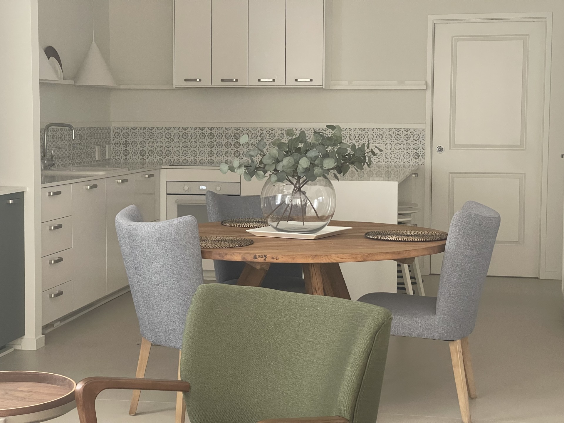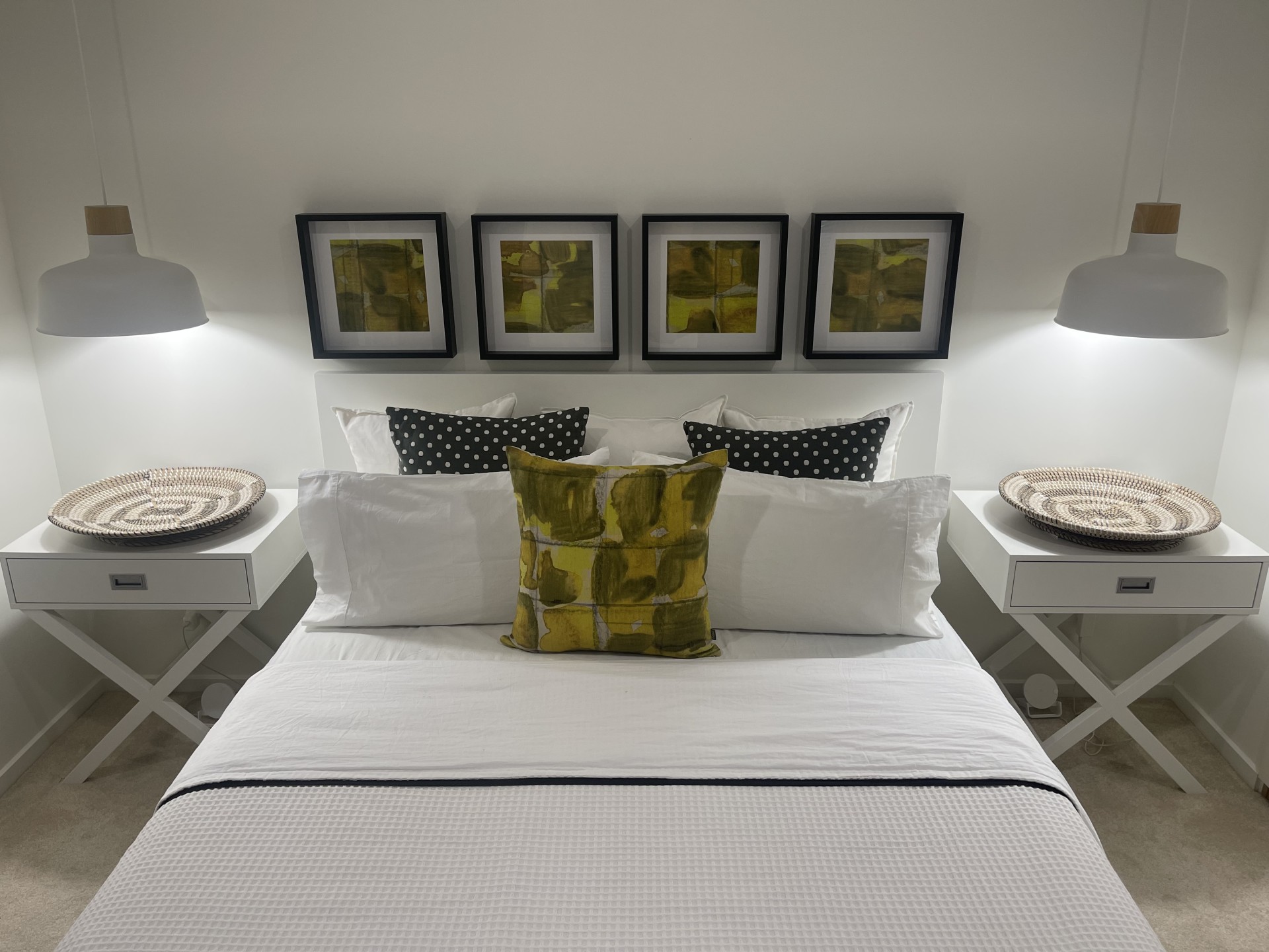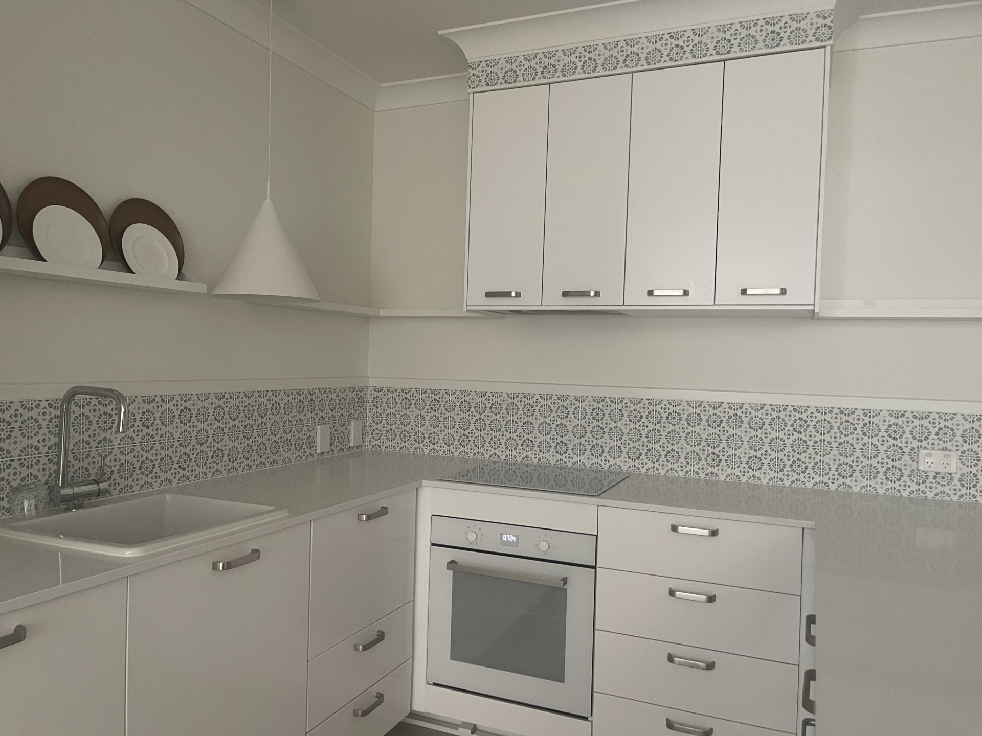 The area boasts 600 x 600 neutral floor tiles and opens up onto the enclosed Patio. Provision is made for a wall-mounted TV as socket and power point is installed. A gorgeous, trendy green, custom-built, coffee/wine cabinet has your drinks all sorted when you are entertaining. A plumbed fridge recess abuts the drinks cabinet. The dining area comes complete with breakfast bar, stunning wall - mounted cabinet with tile trim, and space to hang a fabulous piece of wall art. The kitchen is the real hero of this area as it oozes character. Elegant pendant lights illuminate your bench space. A charming wall tile coupled with dreamy white cabinets and stone bench tops, turns your cooking area into a modern country kitchen. An integrated, state of the art dishwasher minimises washing up. A large porcelain sink, built in microwave, concealed range hood, and induction cooktop add to the modern feel of the hub of the home.