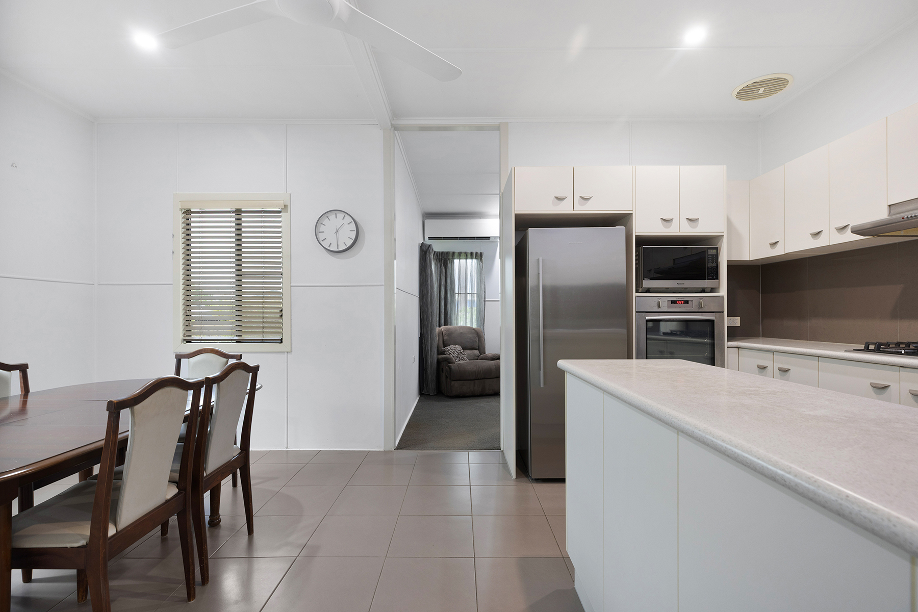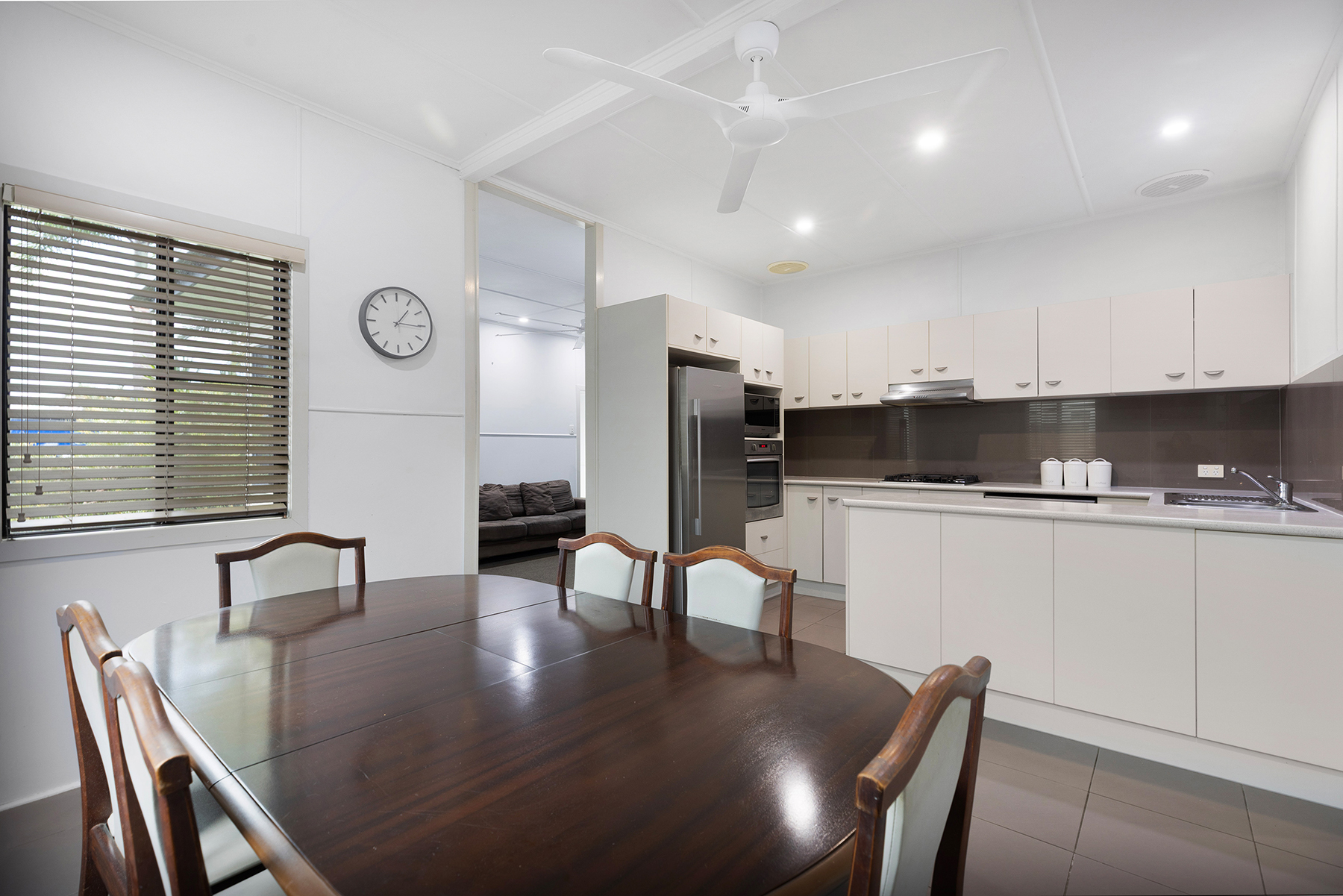 The kitchen overlooks the dining area which comfortably fits an 8-seater table.