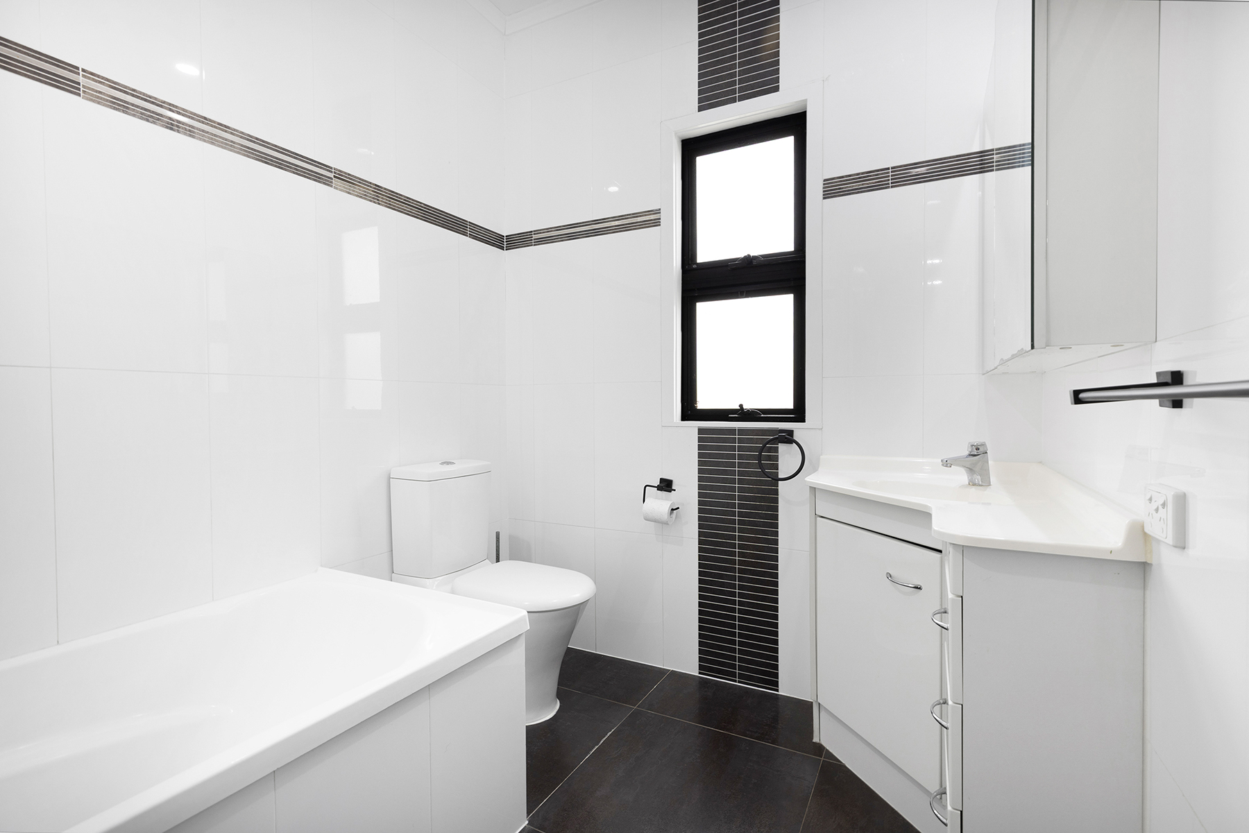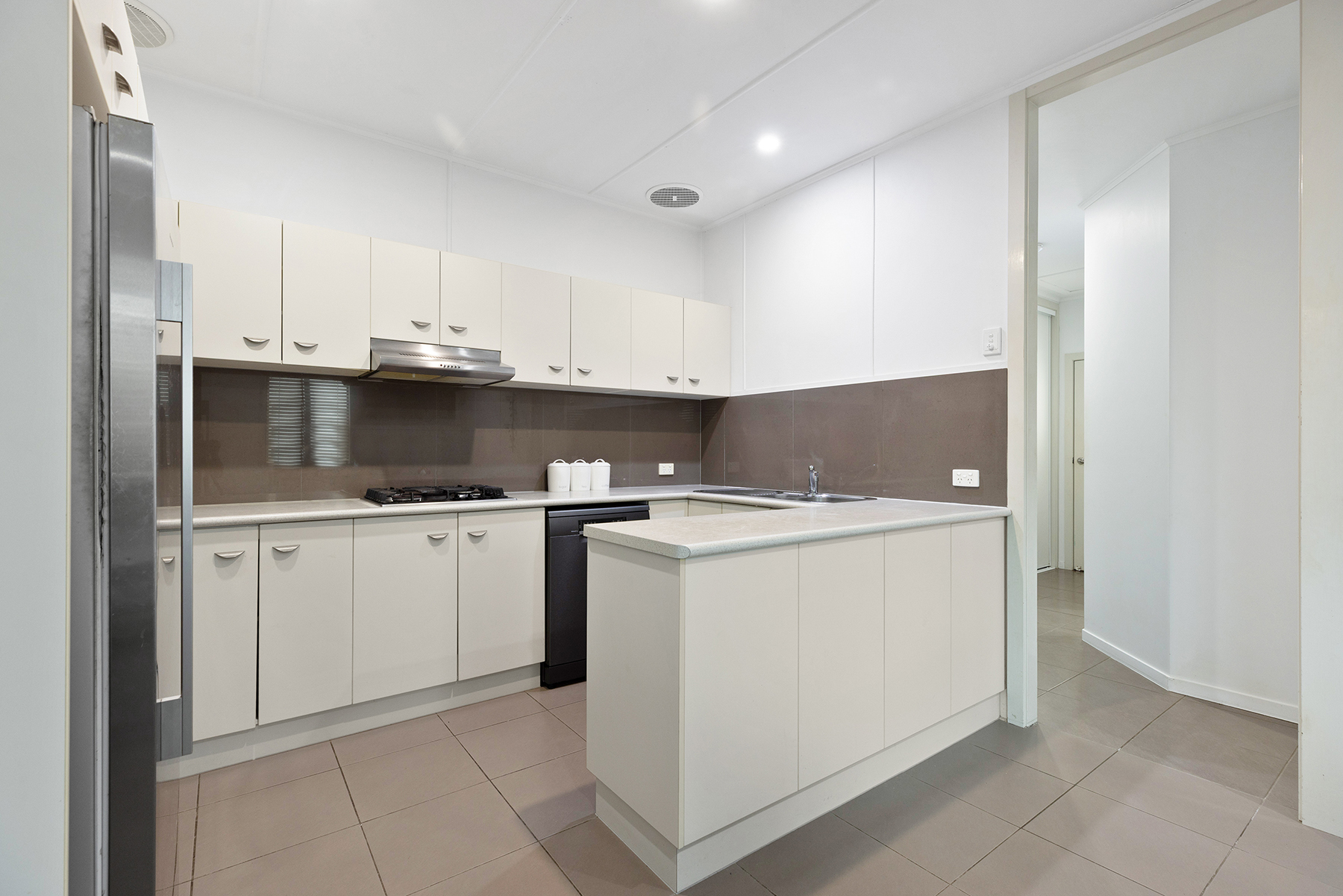 The modern kitchen has ample cupboard & bench space. It is equipped with quality stainless steel appliances, including dishwasher, gas 4-burner cooktop, rangehood & fan-forced oven.