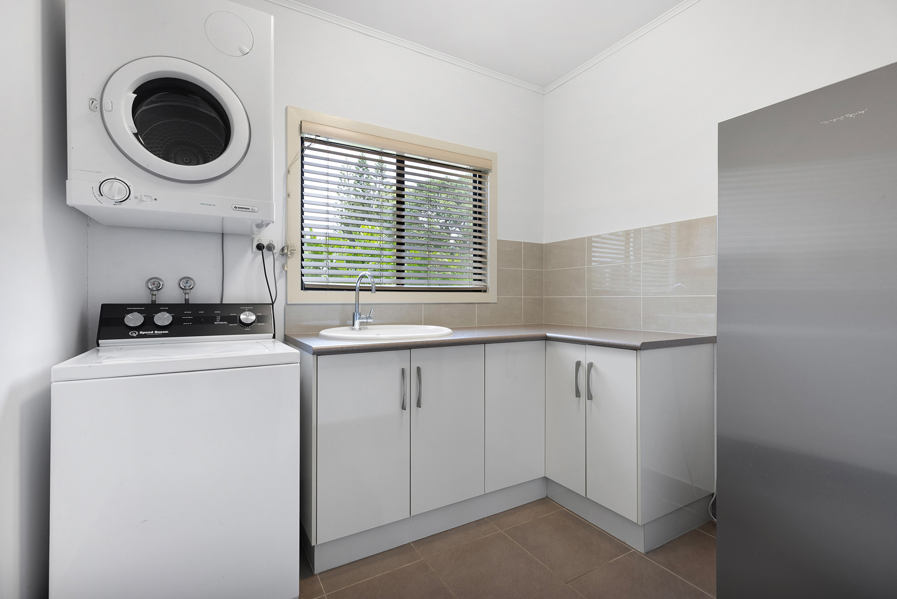 The laundry has a deep porcelain sink, ample cupboard & bench space, with plenty of room for a washing machine, clothes dryer & a second fridge/freezer.