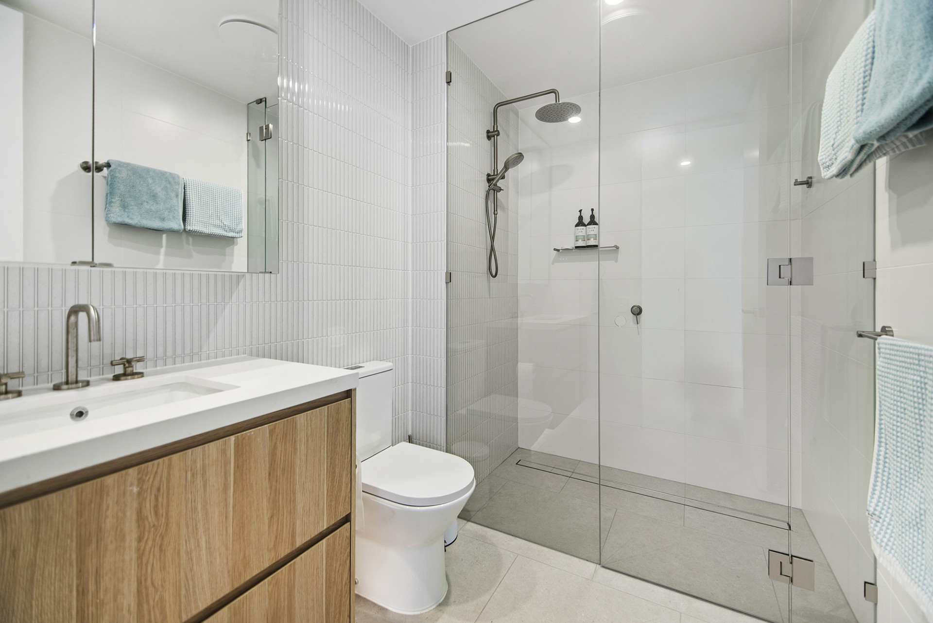 Both bathrooms have large showers and modern fittings. The ensuite includes a full size bath. The kitchen comes with integrated dish washer, microwave, rubbish bins and a Bosch oven with gas cook tops. Ducted air conditioning is provided to the bed rooms and the open plan kitchen/living area.