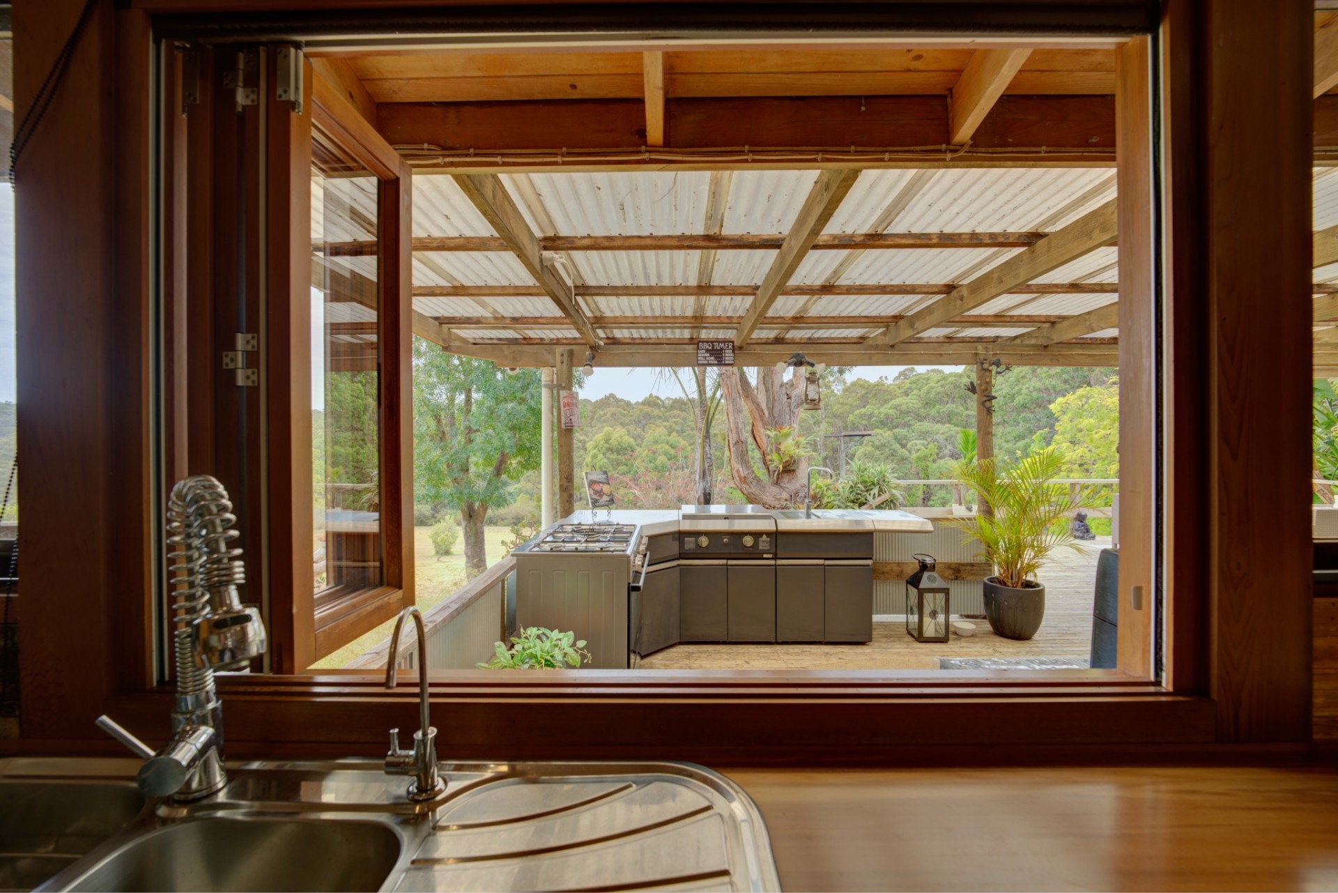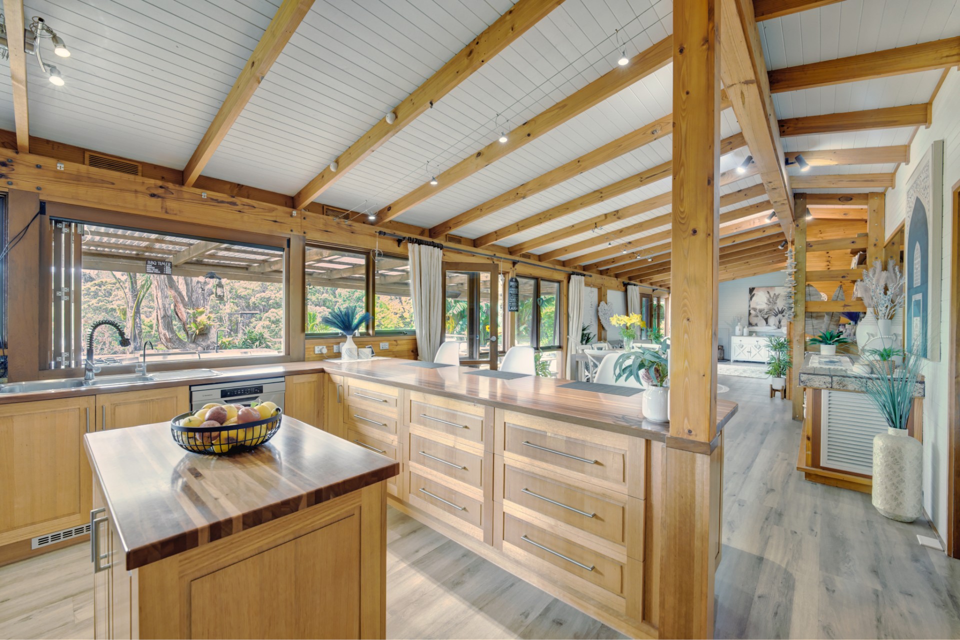Inside, recent updates have elevated this home even further, with new floor coverings and fresh paint, providing a light fresh and inviting atmosphere. The updated ensuite adds a touch of modern luxury, enhancing the home's appeal even further. The heart of the home, the kitchen, is both practical and beautifully presented with quality appliances and a convenient servery window connecting directly to the outdoor kitchen - ideal for entertaining during warm evenings or enjoying quiet mornings surrounded by nature.