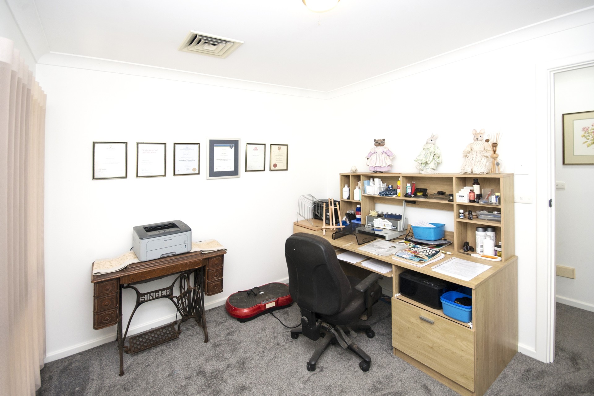 Double jarrah doors at the entrance lead to the atrium, with 3 car garage to the right and entry ahead. Right of the entry is the master suite with a massive "larger than it looks" walk-in robe and a large size en suite. Laundry and lounge are both ahead. From lounge/dining we enter the spacious galley style kitchen with pantry, appliance cupboard, dishwasher, large fridge/freezer alcove, microwave, electric induction hotplate, oven, ample storage and heaps of bench space.