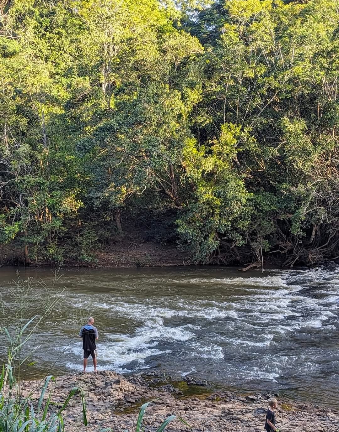 - Established gums and mahogany trees creating a parkland before the rapids and river.