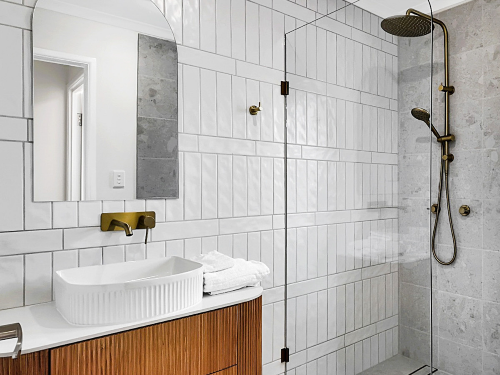 The main bedroom is adjacent to the bathroom, with beautifully positioned walk-in shower, vanity and separate loo.