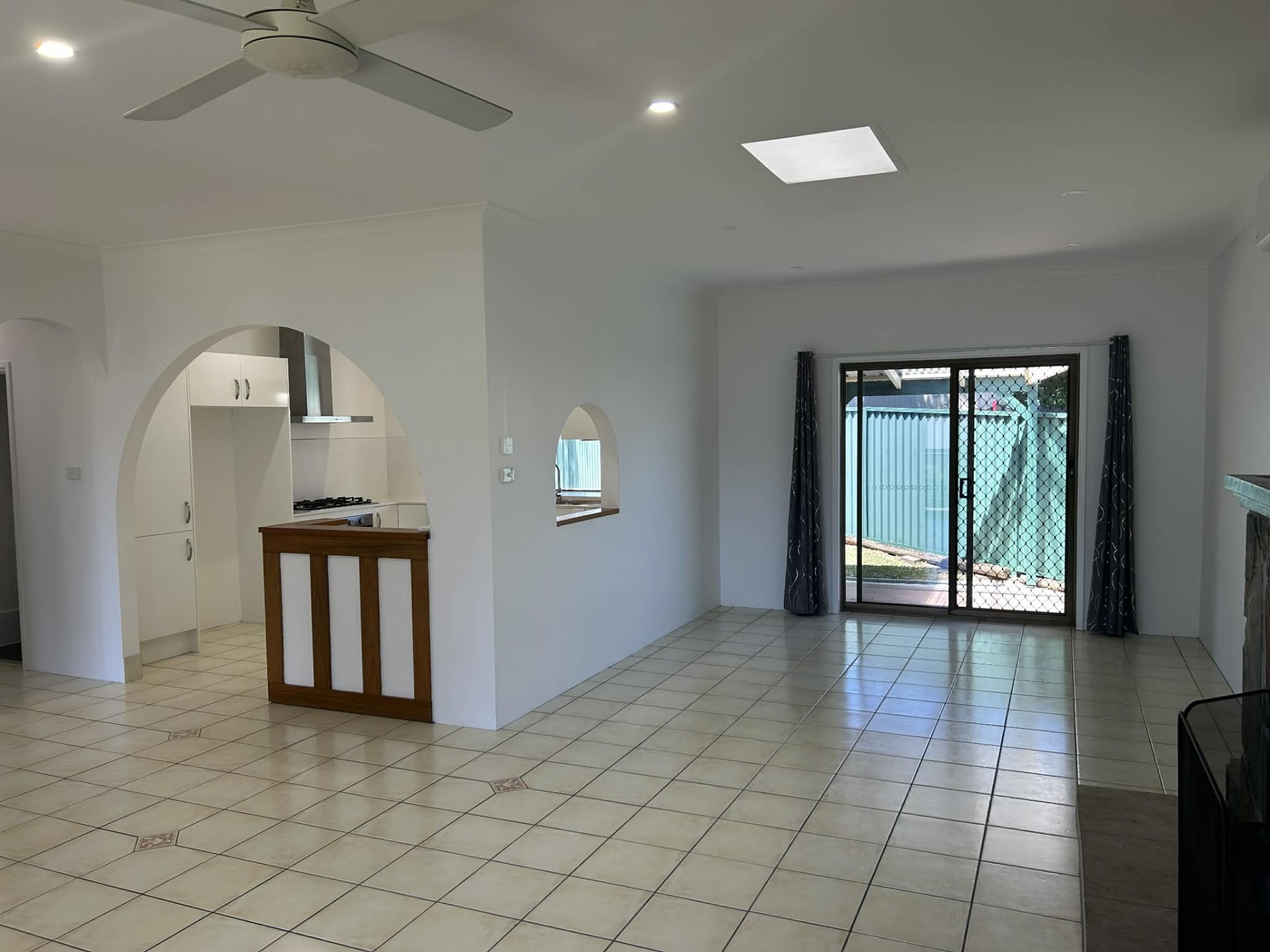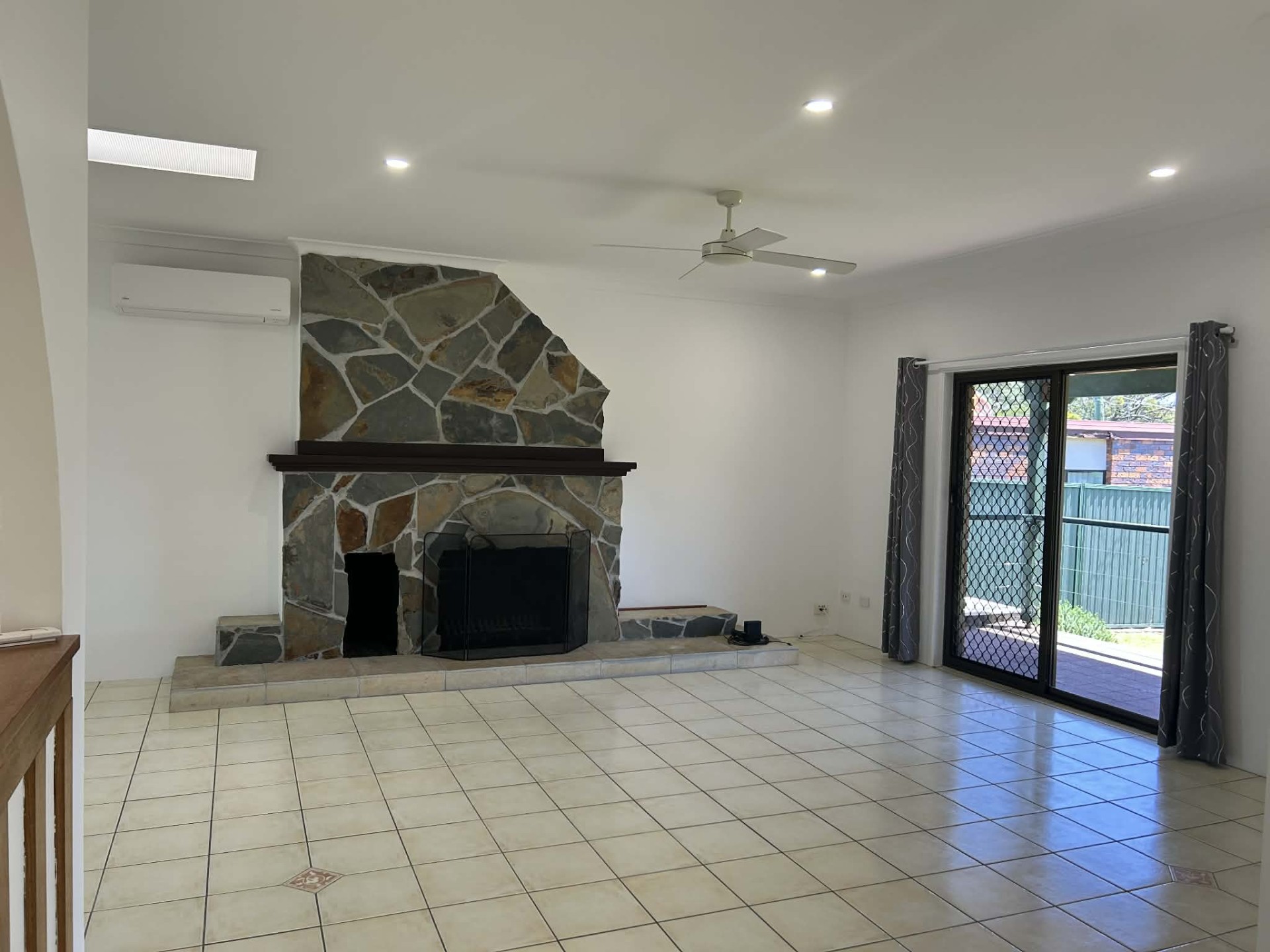 *Tiled open plan living area with ceiling fan, reverse cycle air conditioner and a feature fireplace