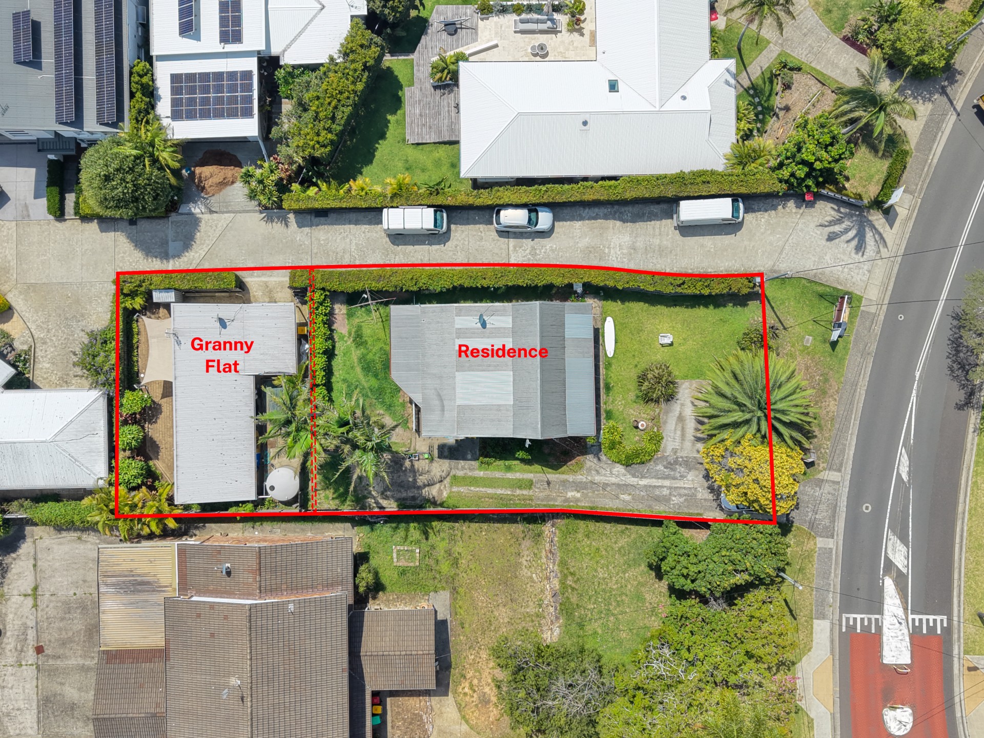 Currently comprising an older 2/3-bedroom cottage and a modern two-bedroom granny flat with a private courtyard, the property provides immediate rental income while you plan and design a bespoke two-storey home.
