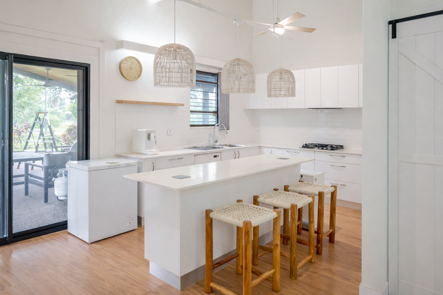 At the centre of the home is a huge open-plan kitchen, living and dining zone designed for everyday living and entertaining. Double doors open wide to a spacious alfresco entertaining area, seamlessly connecting indoors and out and capturing cooling breezes and greenbelt views. Complete with ceiling fans and adjustable downlights, this space is ideal for long lunches, evening drinks or relaxed family gatherings year-round.