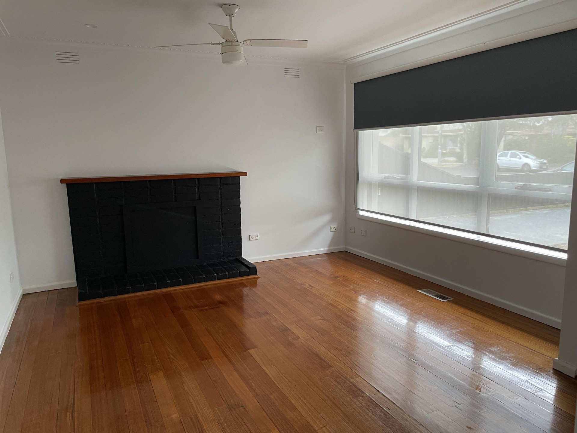 A spacious lounge with polished boards and an open fire place space.