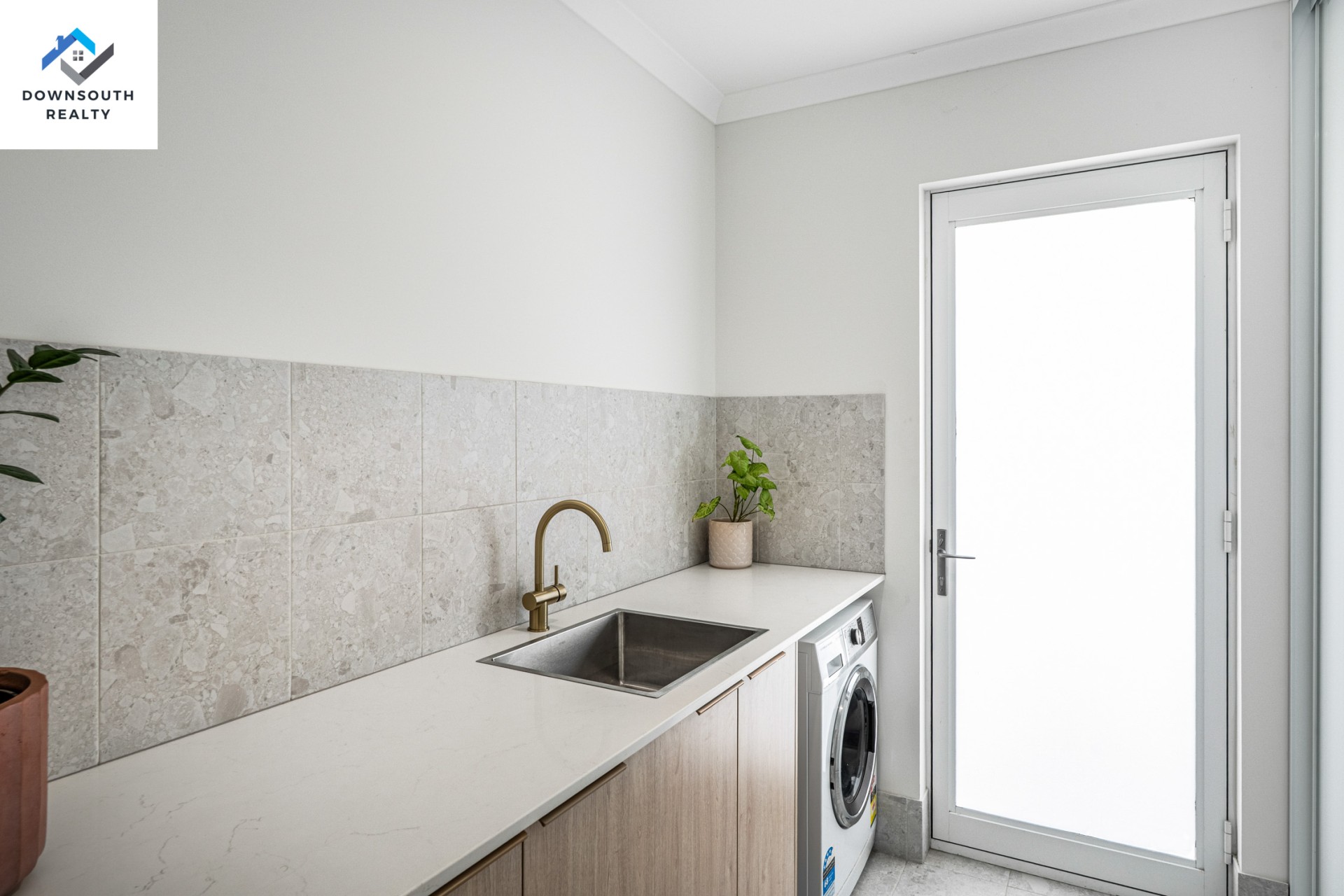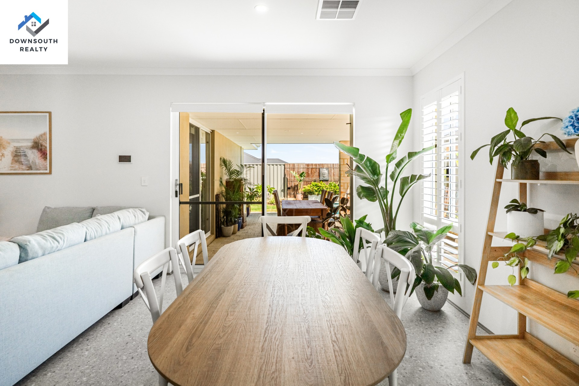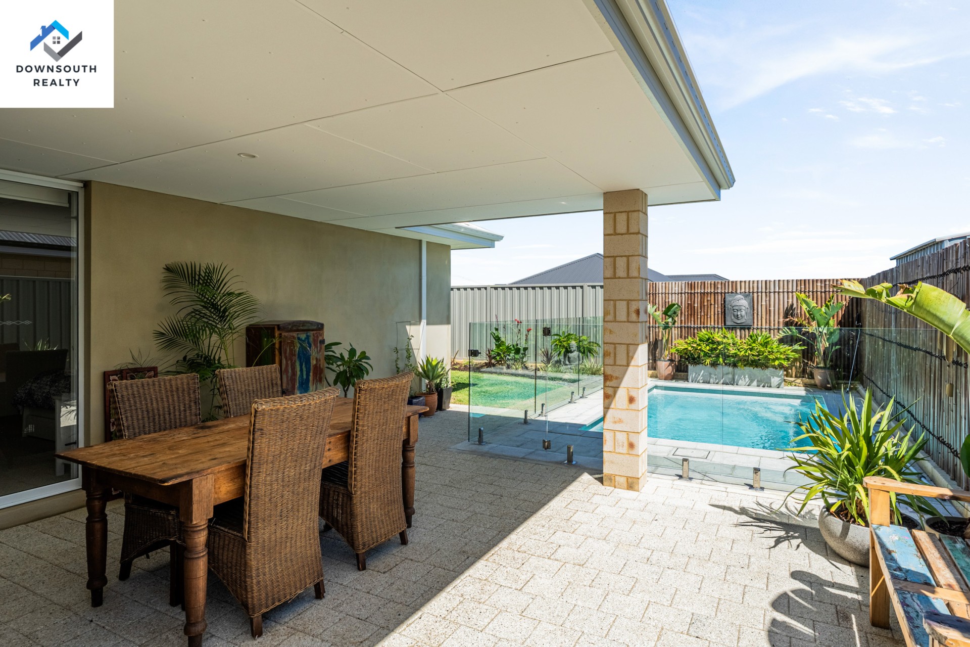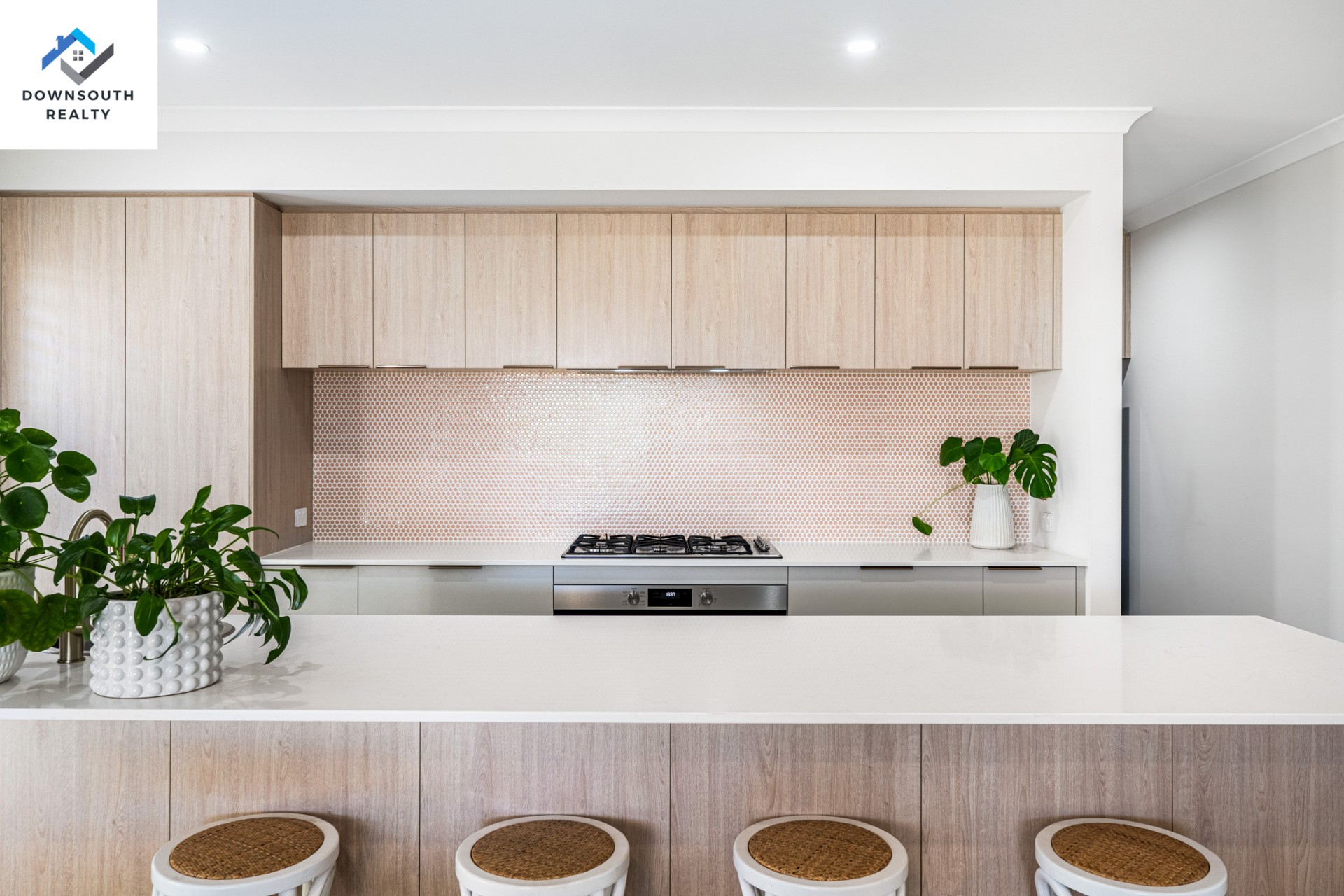 Modern family home at 8 Blueberry Loop, Byford, offers a north-facing design, ducted air conditioning throughout, and higher-than-normal ceilings in the living room. The stone kitchen benchtop with butler's pantry supports effortless hosting, complemented by carpet and tile flooring, instant gas hot water, full reticulated gardens, and sparkling in-ground pool.