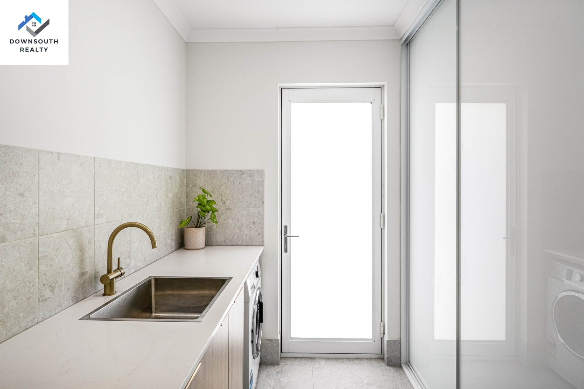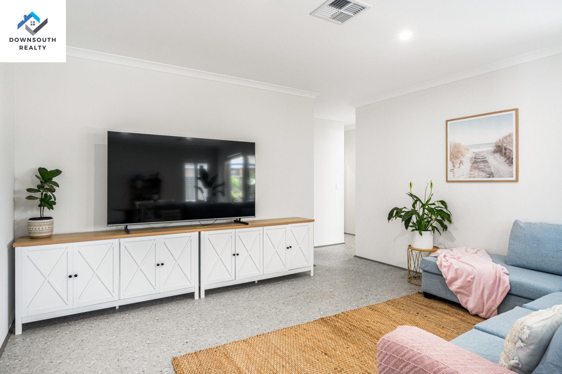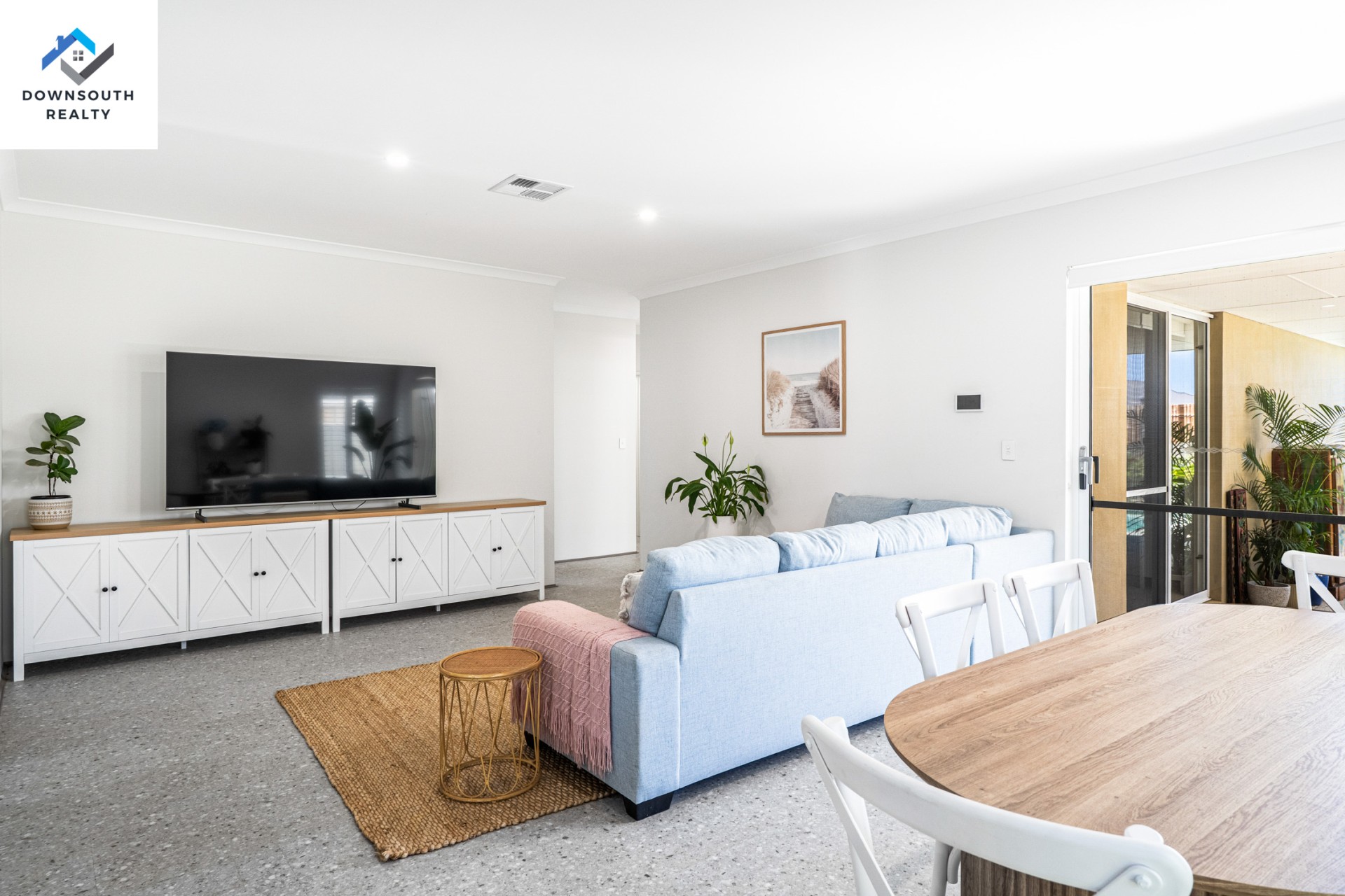Modern family home at 8 Blueberry Loop, Byford, offers a north-facing design, ducted air conditioning throughout, and higher-than-normal ceilings in the living room. The stone kitchen benchtop with butler's pantry supports effortless hosting, complemented by carpet and tile flooring, instant gas hot water, full reticulated gardens, and sparkling in-ground pool.