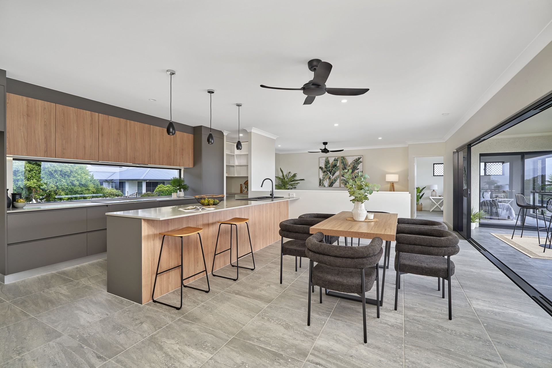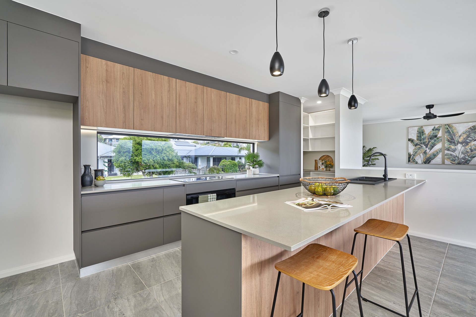 - Seriously striking chef's kitchen with sleek stone benchtops, black Santorini double sink, dishwasher, breakfast bar, induction cooktop, walk-in pantry, loads of storage, rangehood, scenic views front and back and natural light
