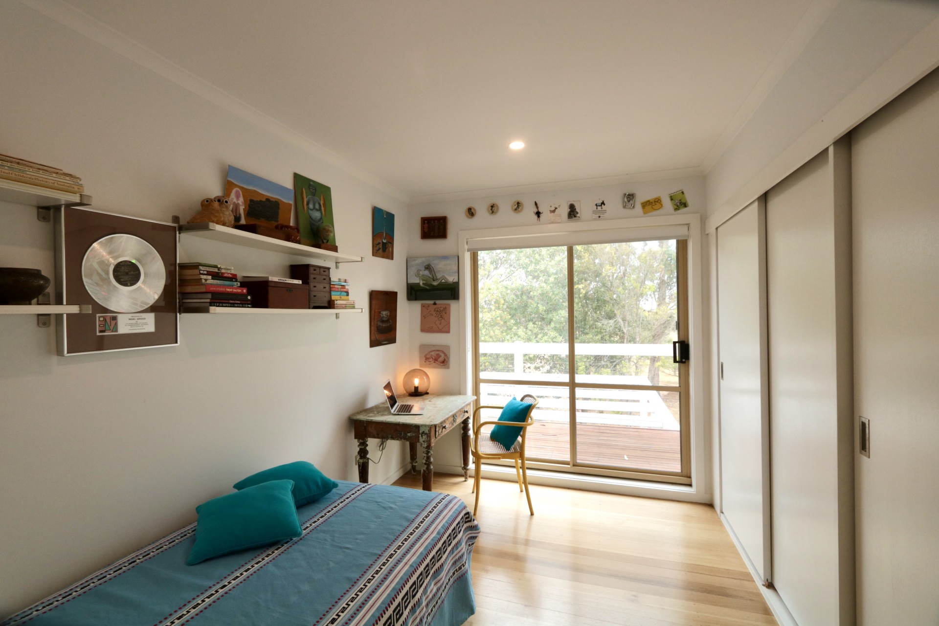 The spacious main bedroom with ensuite has a walk-in robe plus another robe with floor-to-ceiling shelving and hanging space. Double aspect views from 3 sliding doors lead to the deck and offers a lovely treed vista.