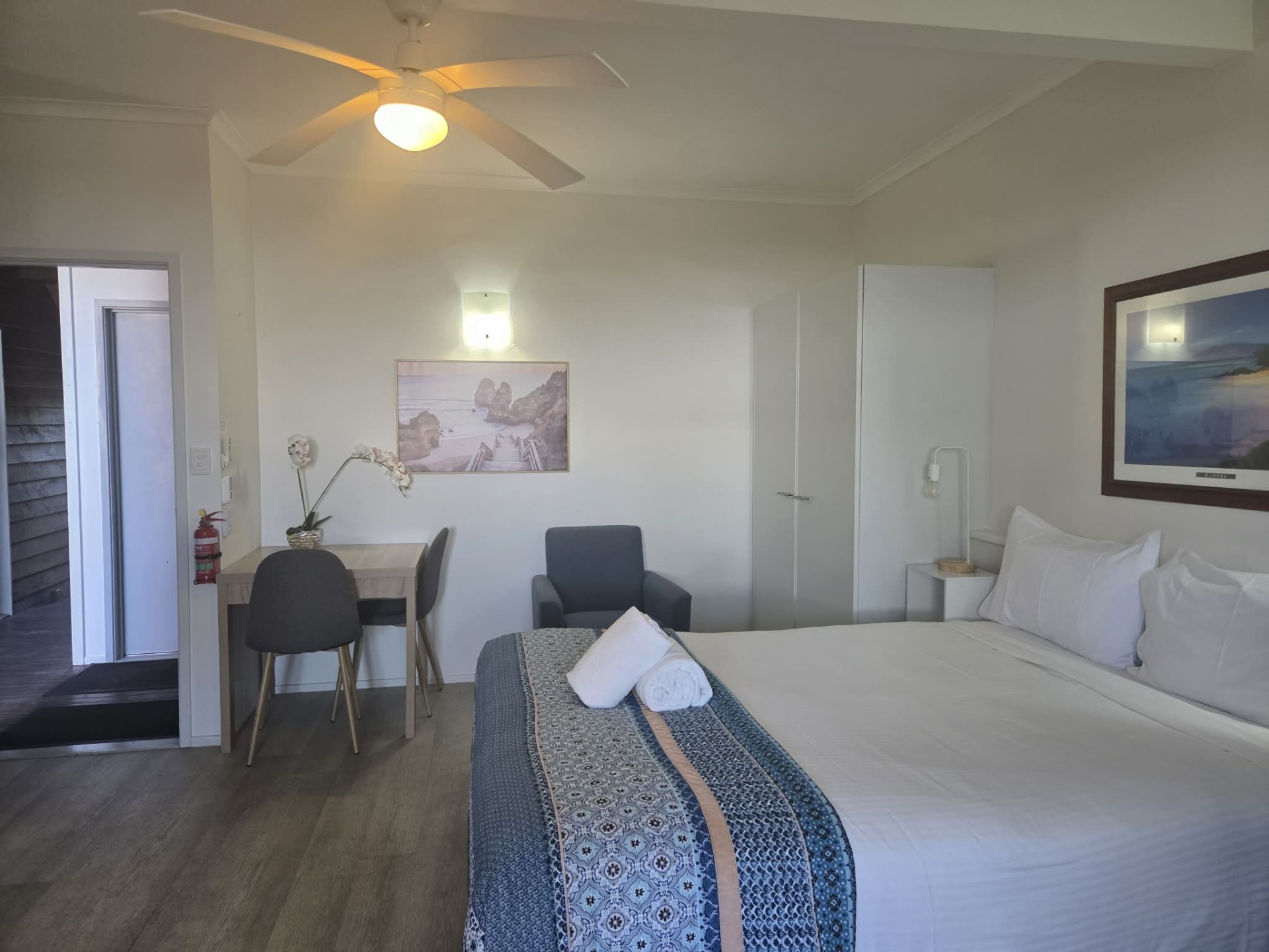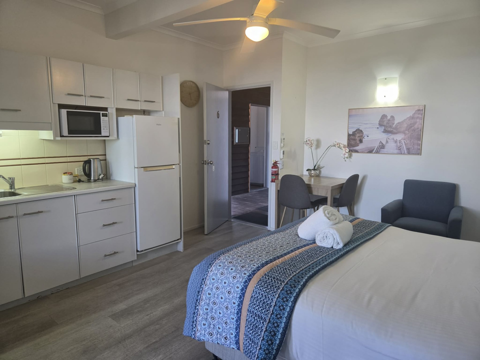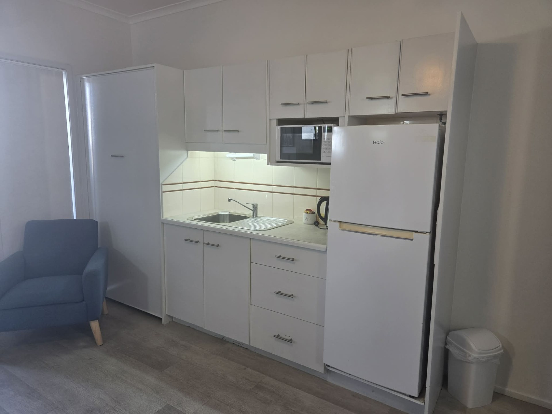• Functional kitchenette with electric hotplate, rangehood, microwave and bar fridge