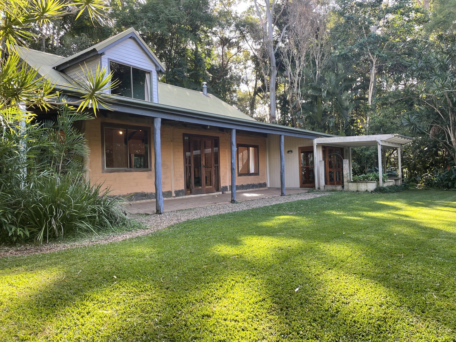 Lovely home surrounded by nature and built from natural materials nestled in the Byron Bay hinterland on a quiet no through road. Light the fire box and enjoy visits from birds and wallabys.