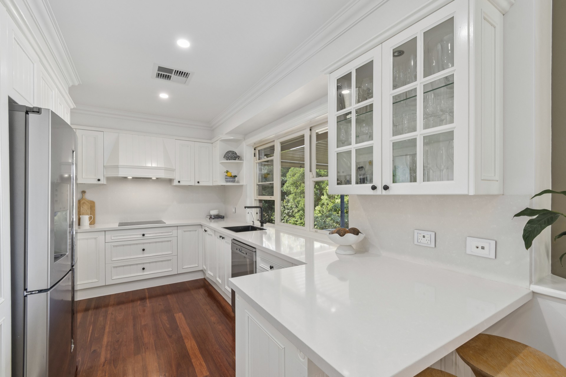 ~ Spacious kitchen overlooks views to the south with stone benchtops/ splashbacks, induction cooktop and plumbed refrigeration.