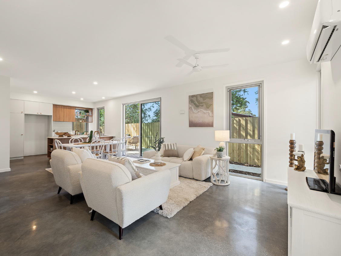 Featuring a spacious open-plan layout with premium finishes throughout, including polished concrete floors, Caesarstone benchtops, electric and Miele appliances, double glazing, and north-facing for natural light.
