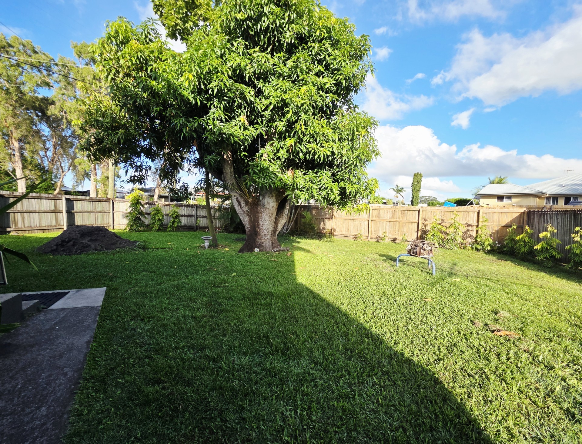 Large backyard featuring a well-maintained Bowen mango tree with delicious fruit