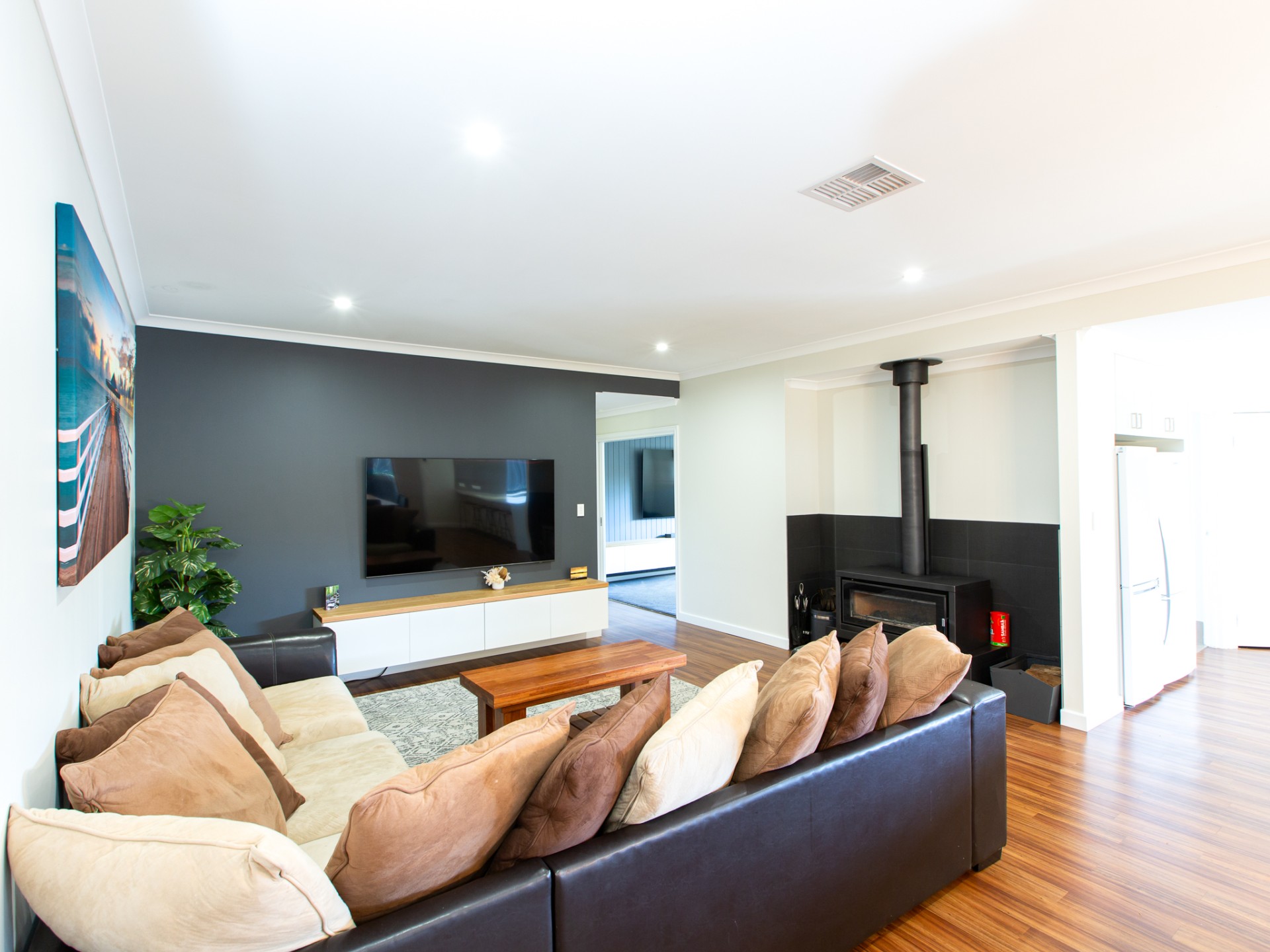 At the heart of the home lies an enormous kitchen that truly sets this property apart. Featuring expansive bench space, abundant storage and a breakfast bar large enough to accommodate the entire family, it overlooks the open plan living and dining area, creating a central hub for everyday living and entertaining. A separate theatre room provides the perfect space for movie nights or a quiet retreat, while reverse cycle air conditioning throughout and a cosy fireplace ensure year-round comfort.