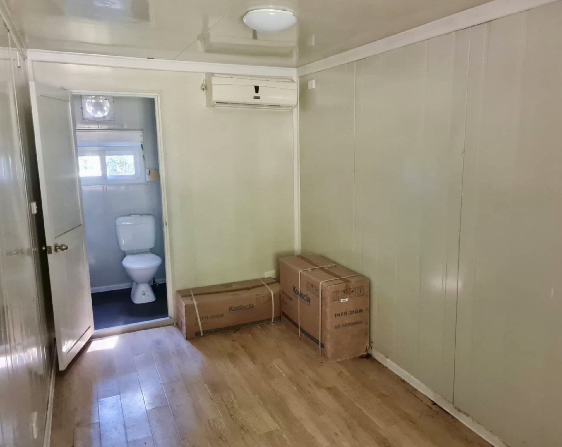 The converted 20ft shipping container has a toilet and shower though it is unconnected. A small mower shed sits off to the side.