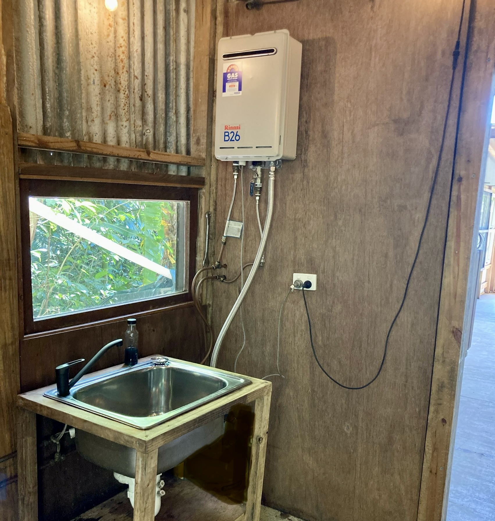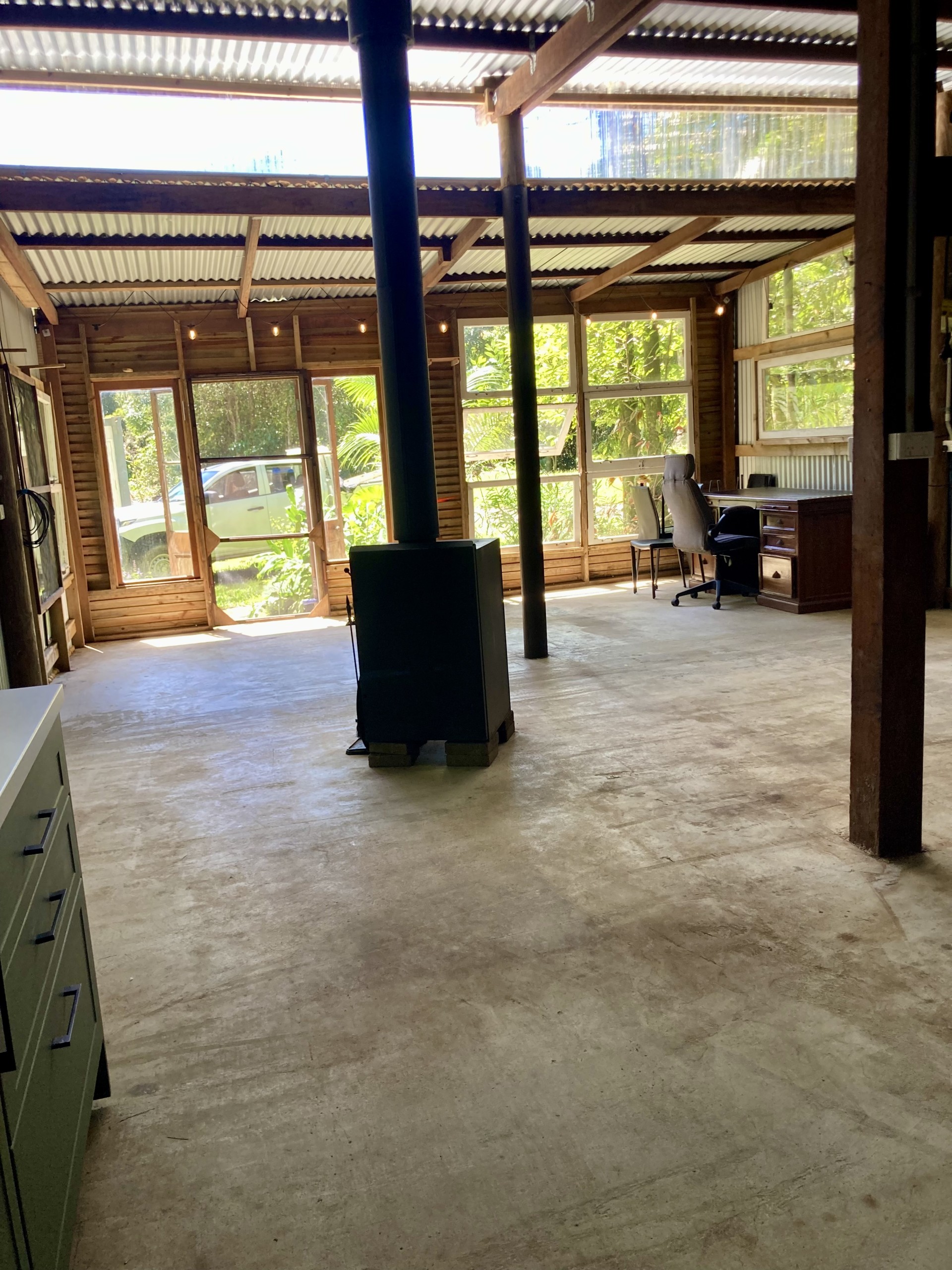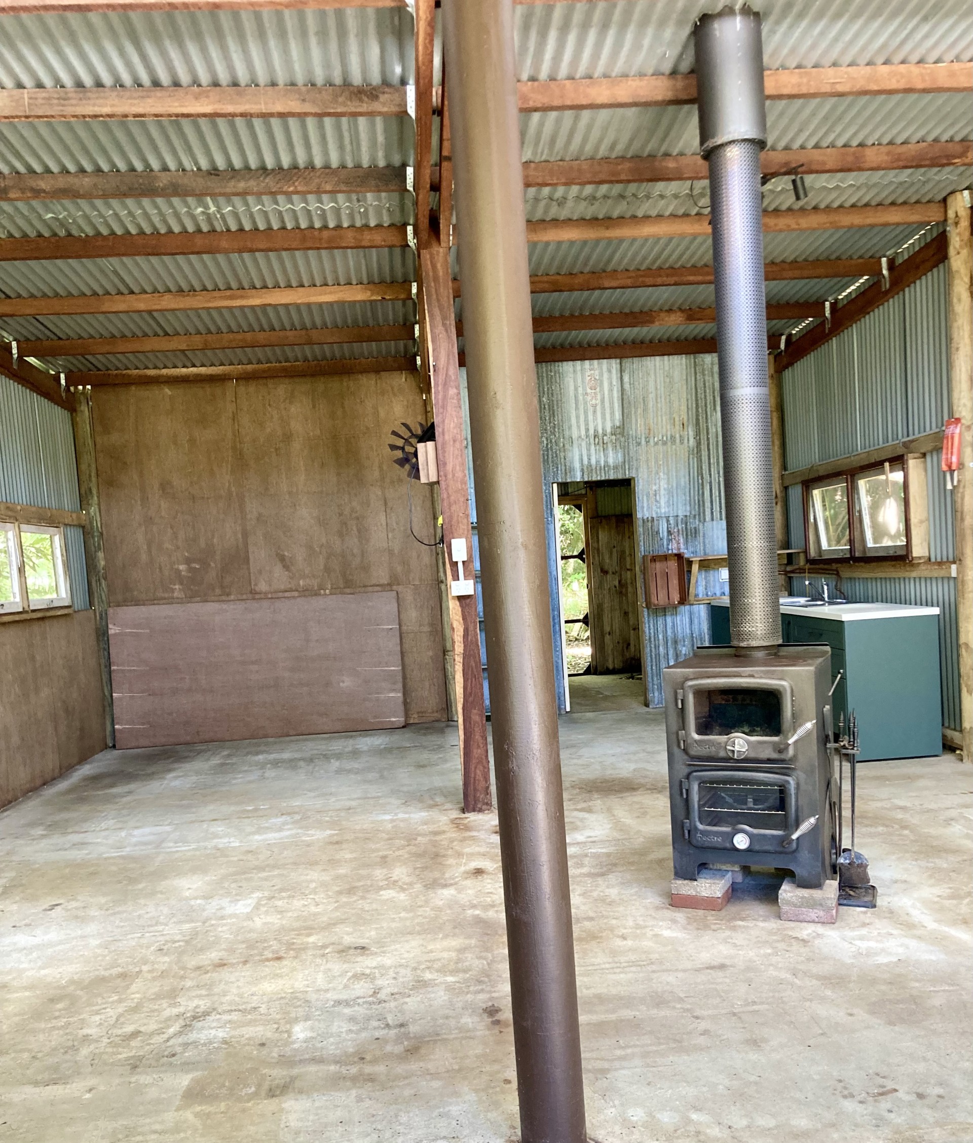The 9x6mt shed has a shower and toilet attached (3.4x3mt) with a continuous gas hot water system and a kitchenette in the main area. The shed has power connected with 10 and 15 amp plugs.