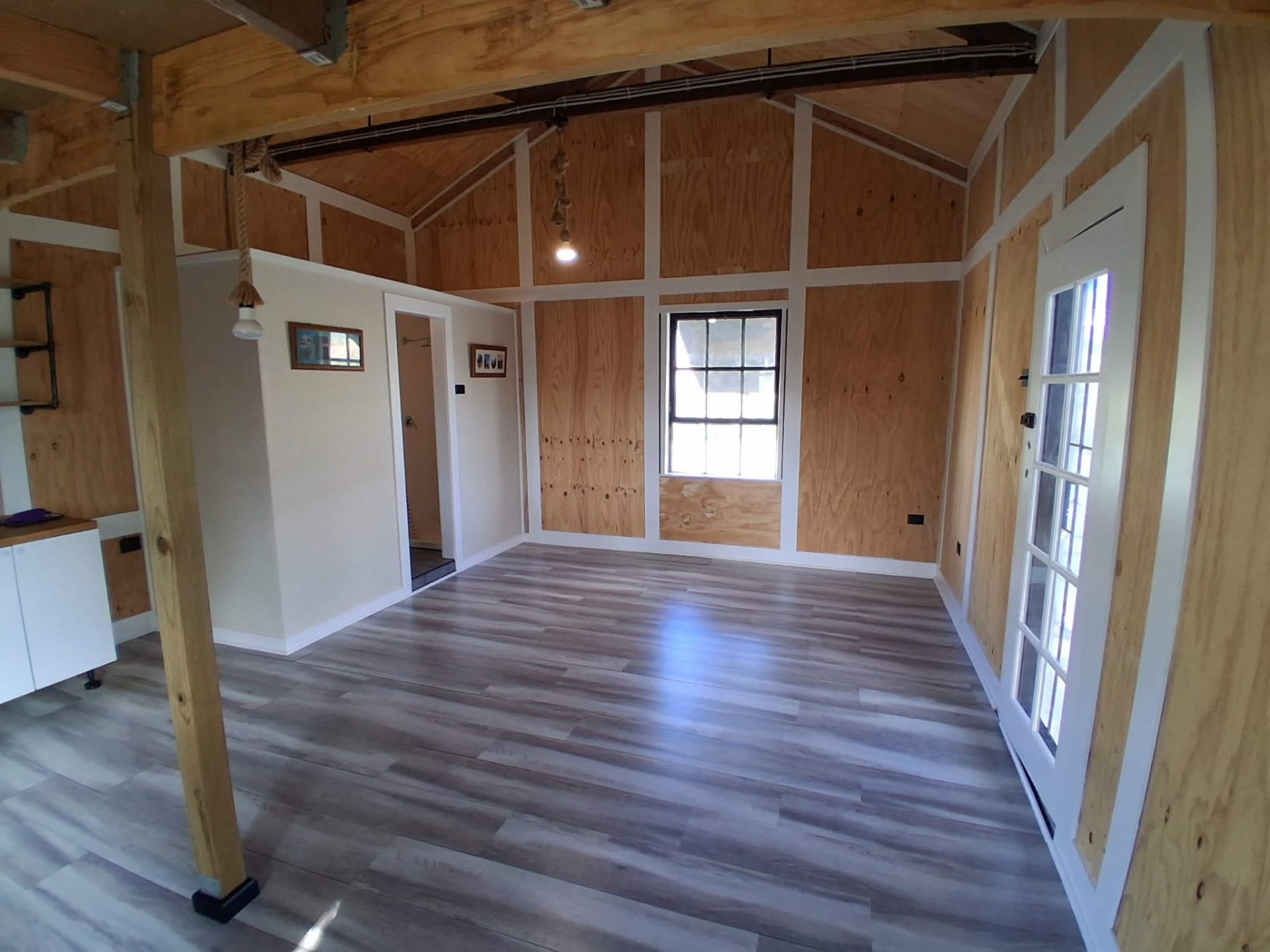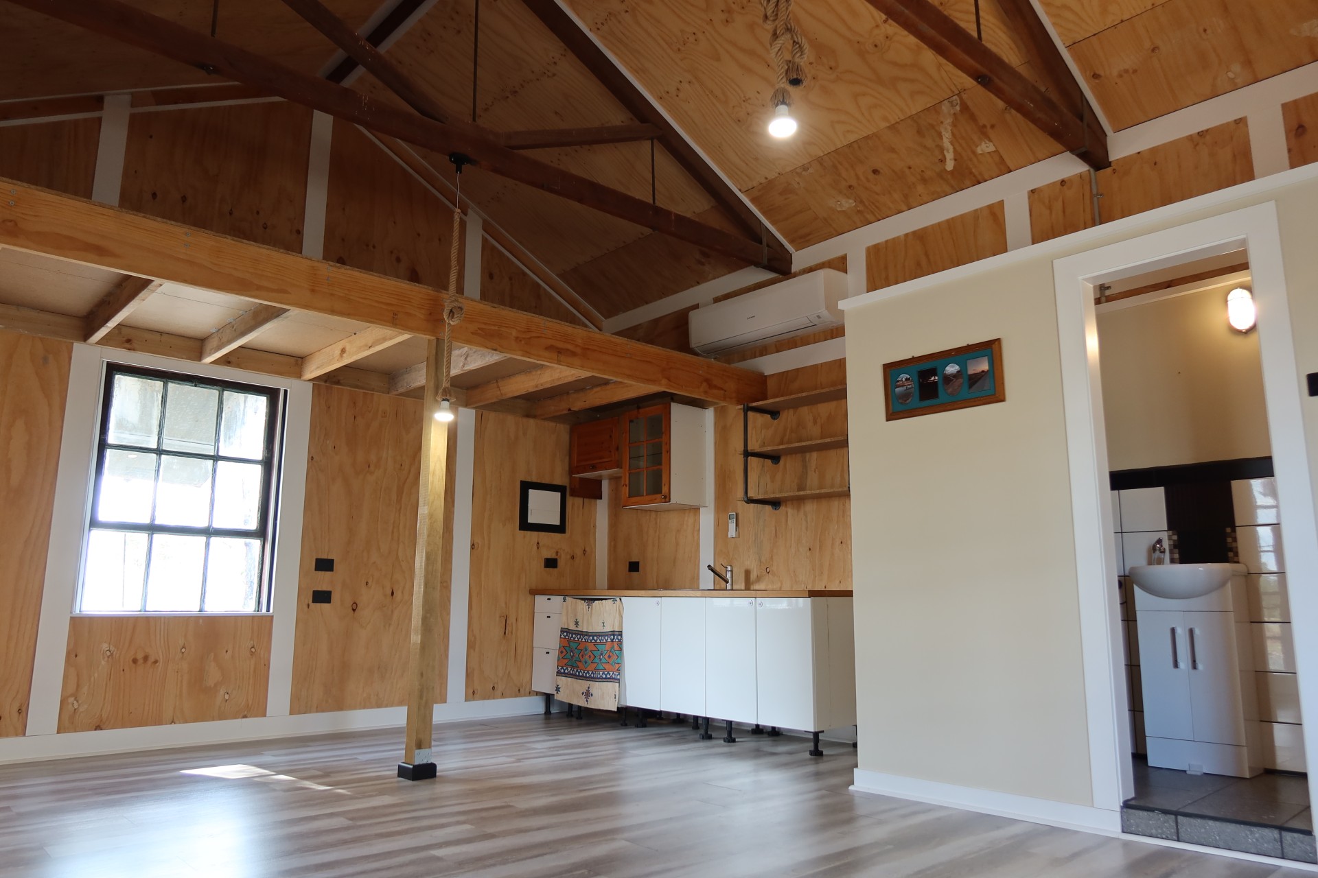 -Shed lined with wall and ceiling insulation, vinyl sheet flooring and a wall mounted split system air conditioner