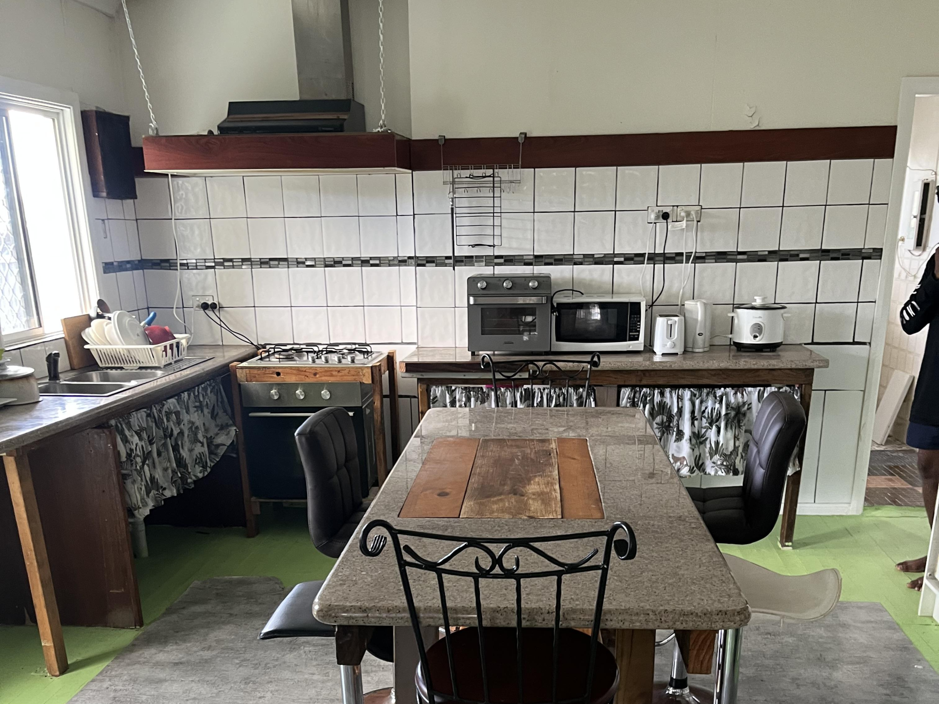 Kitchen has been designed for hard wear with solid thick granite bench tops and granite island table for dining or preparation along with new lpg gas cooktop and electric oven with 900 range hood plus exhaust fan.