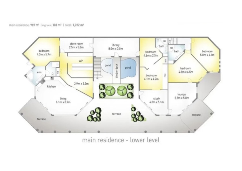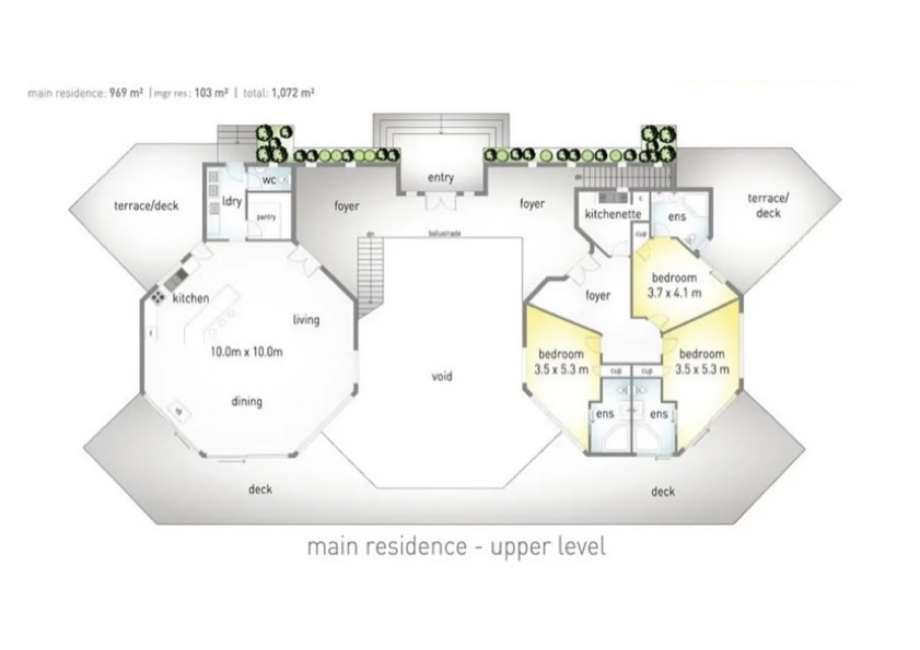 At the heart of the estate is a grand, architect-designed residence of 969sqm, conceived to sit in harmony with the natural landscape and boasting striking scale, aesthetic sophistication and top-of-the-world views. Designed with feng shui principles, its distinctive double-octagonal form flows through breezeways and expansive decks, creating a seamless connection between indoor and outdoor living. Throughout the home, an emphasis on light, airflow and spatial volume creates relaxation and elegance. The flexible two-level layout may function as a spacious family residence with 9+ bedrooms or multiple self-contained zones, providing accommodation for up to 18 people. Generous living areas, high ceilings, private terraces and spa-appointed bathrooms contribute to a sense of comfort and luxury. Balinese doorways lead out to dreamy tranquil gardens, Buddha statues, Moroccan-inspired courtyards and bridged fish ponds with waterfalls, creating a true sanctuary of peace and beauty.
